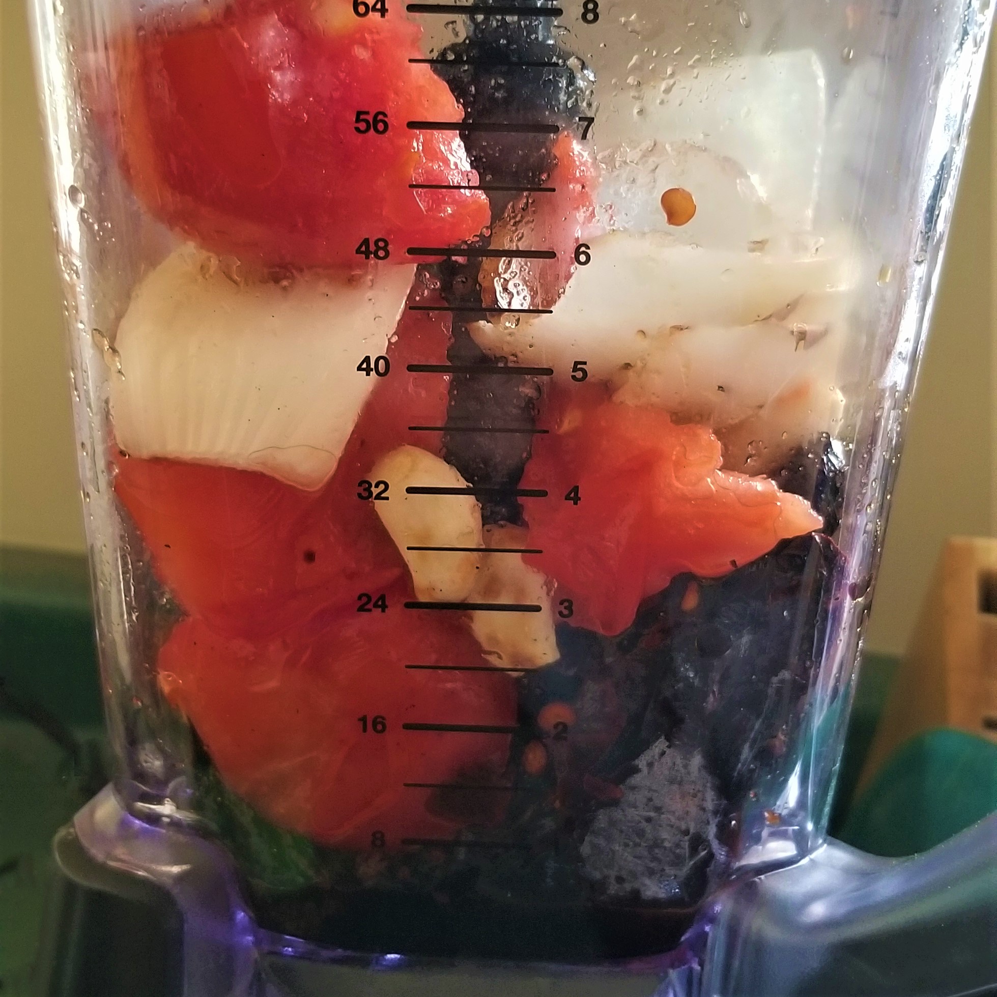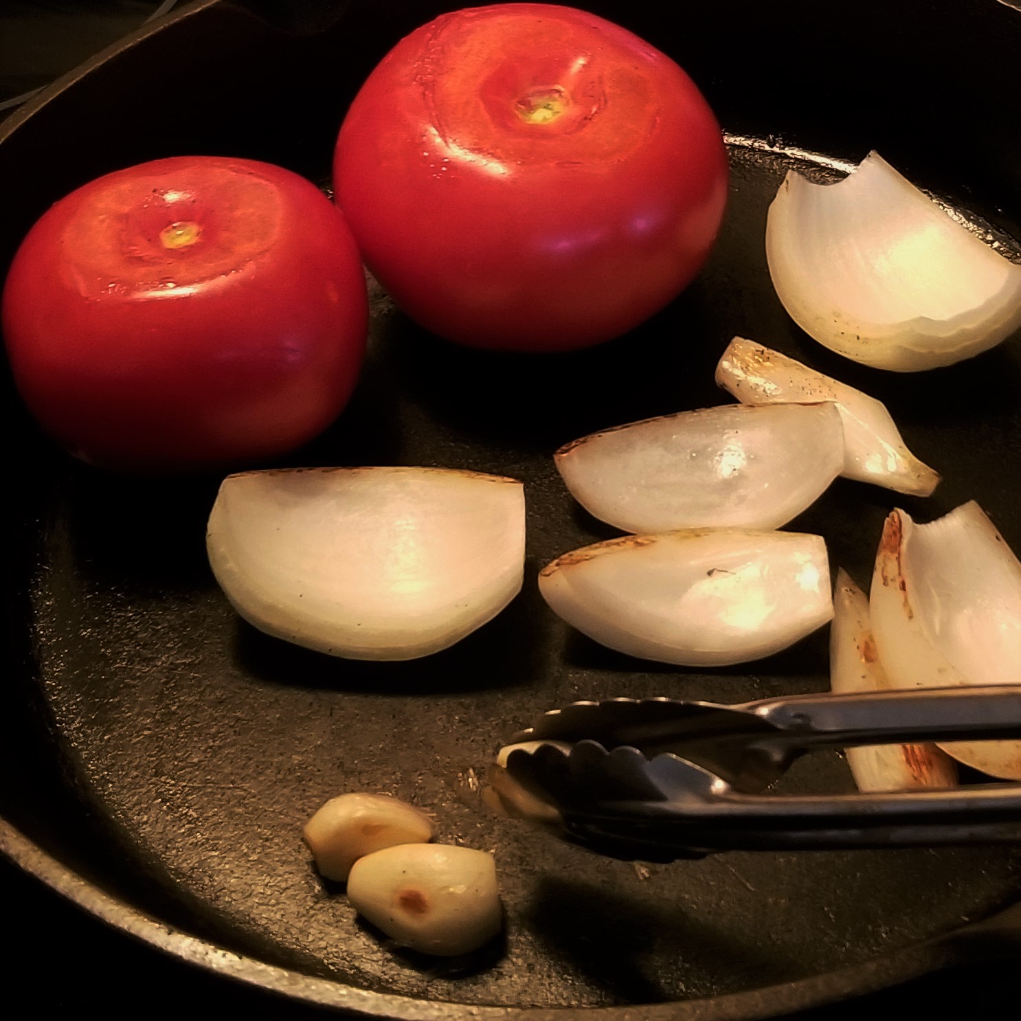 While the peppers soak, roast the tomatoes, onion and garlic in the same skillet; remove garlic first so it will not burn (photo below, left), and continue roasting the rest until nicely charred (“tatemados”). Remove from heat and allow to cool down; remove stem ends from tomatoes. Once the peppers are hydrated and everything has cooled down, place peppers and soaking liquid, salt, half the almonds (reserve the other half, for garnish), tomatoes, onion, and garlic in a blender jar (photo below, right):