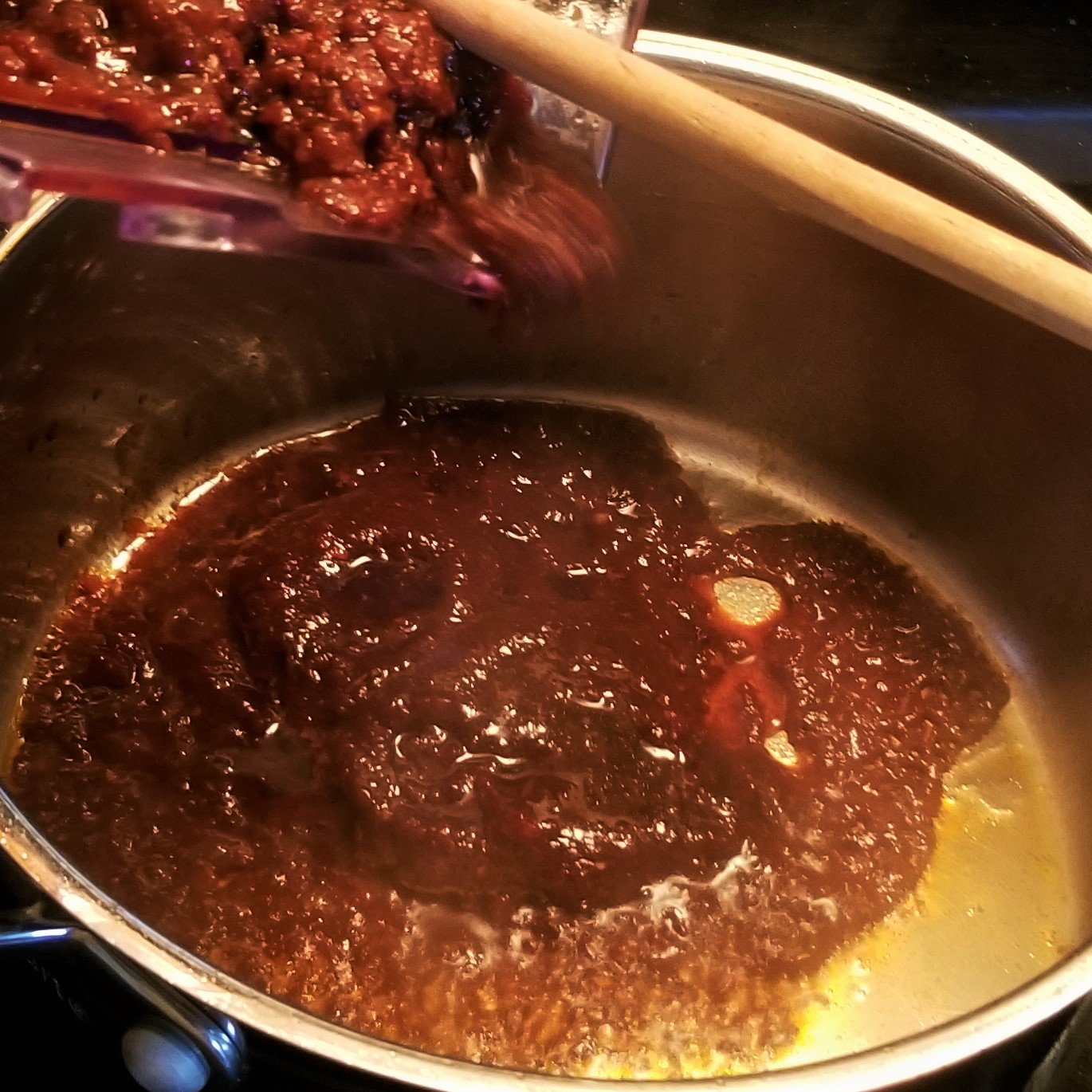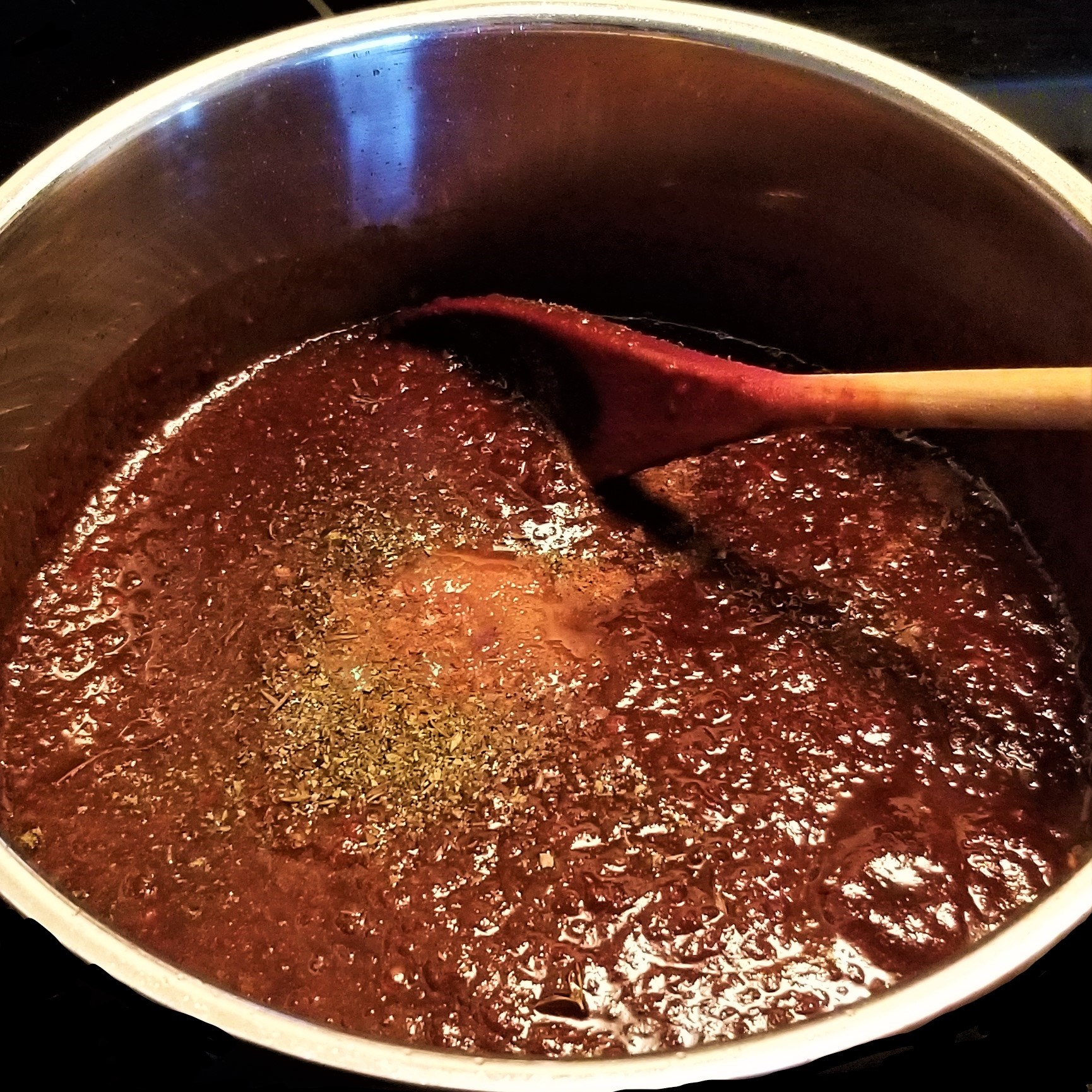 Process for at least one minute, until the texture is smooth and there are no chunks left. In a pot, warm up oil over medium heat, then pour sauce (photo below, left); stir and let fry for a few seconds, then add cinnamon, cloves, black pepper, and crumbled oregano (or marjoram) and thyme, stirring to incorporate (photo below, right):