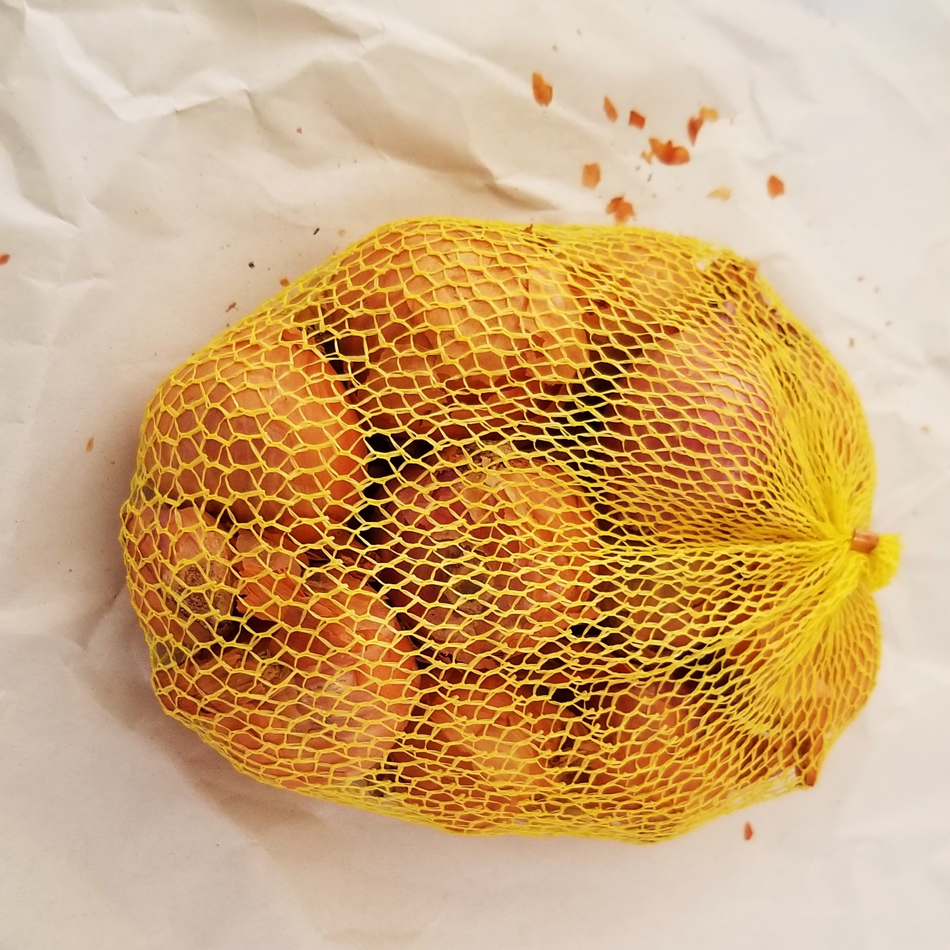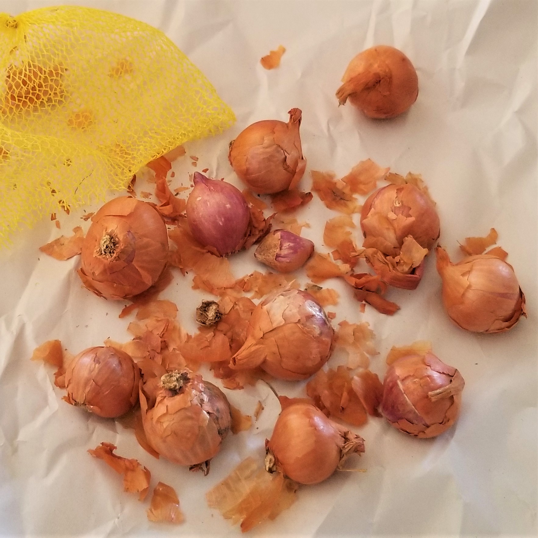Inside, wrapped in craft paper, there was a mesh bag (photo below, left), which contained a dozen onion sets (at the top of this post, and photo below, right):