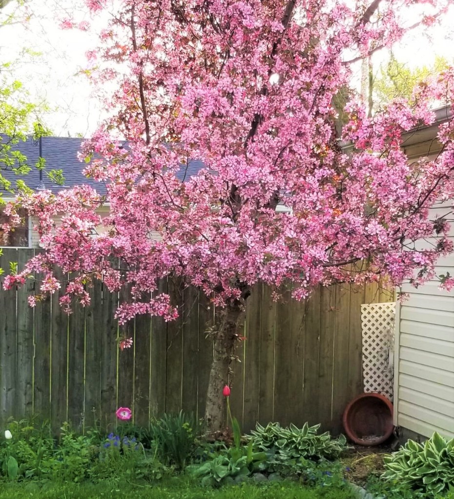 Moving on to a happier note, now that the spring bulbs have faded, I am starting to see irises flowering and lilies growing.  The crabapple tree went from budding  (photo at the top of this post from May 13), to full bloom, really fast:
