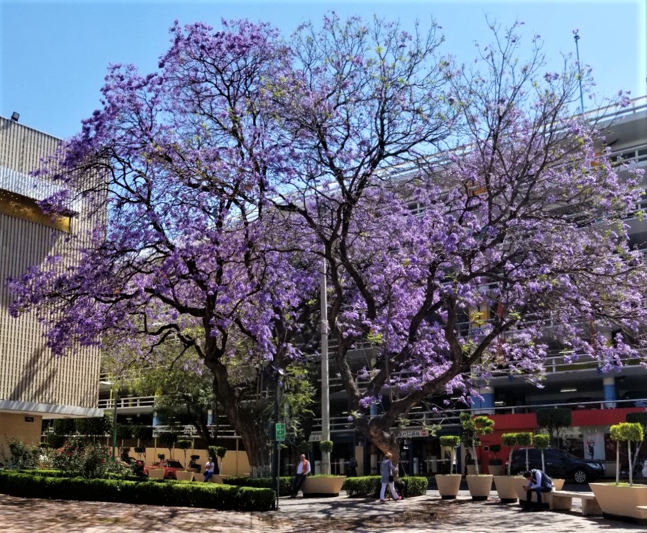 Jacaranda trees in full bloom, outside a department store on Avenida de los Insurgentes ( Mexico City, April 2019)