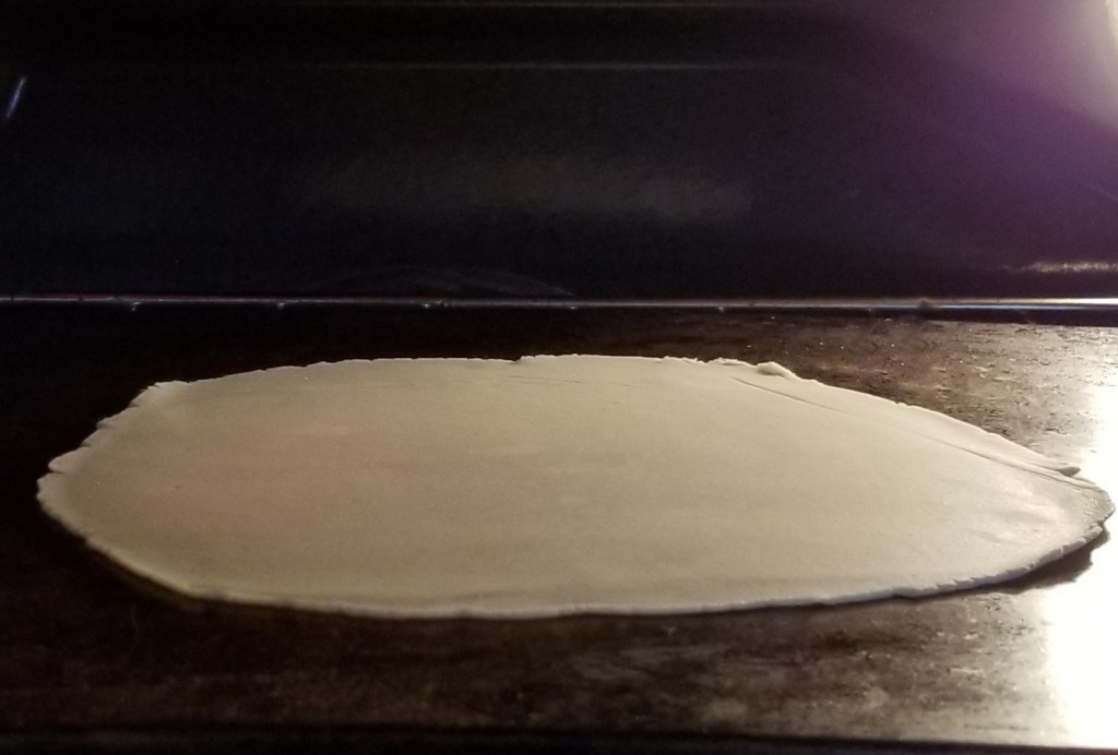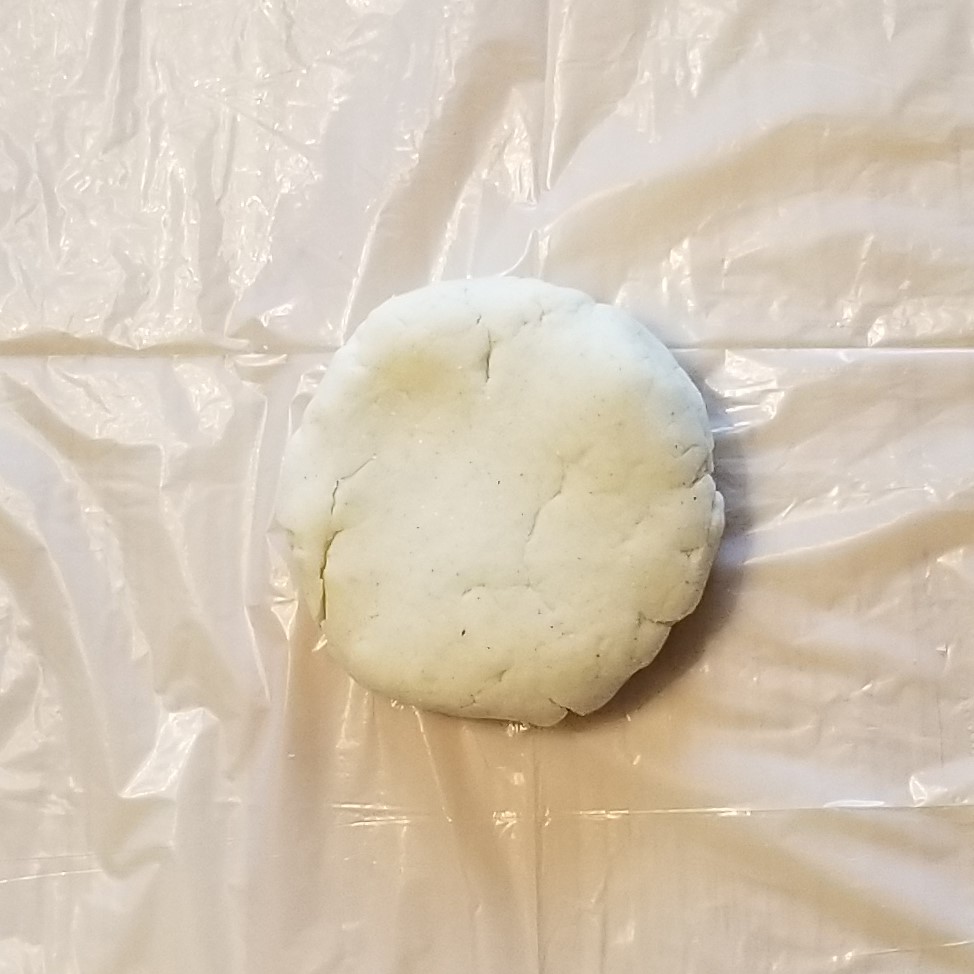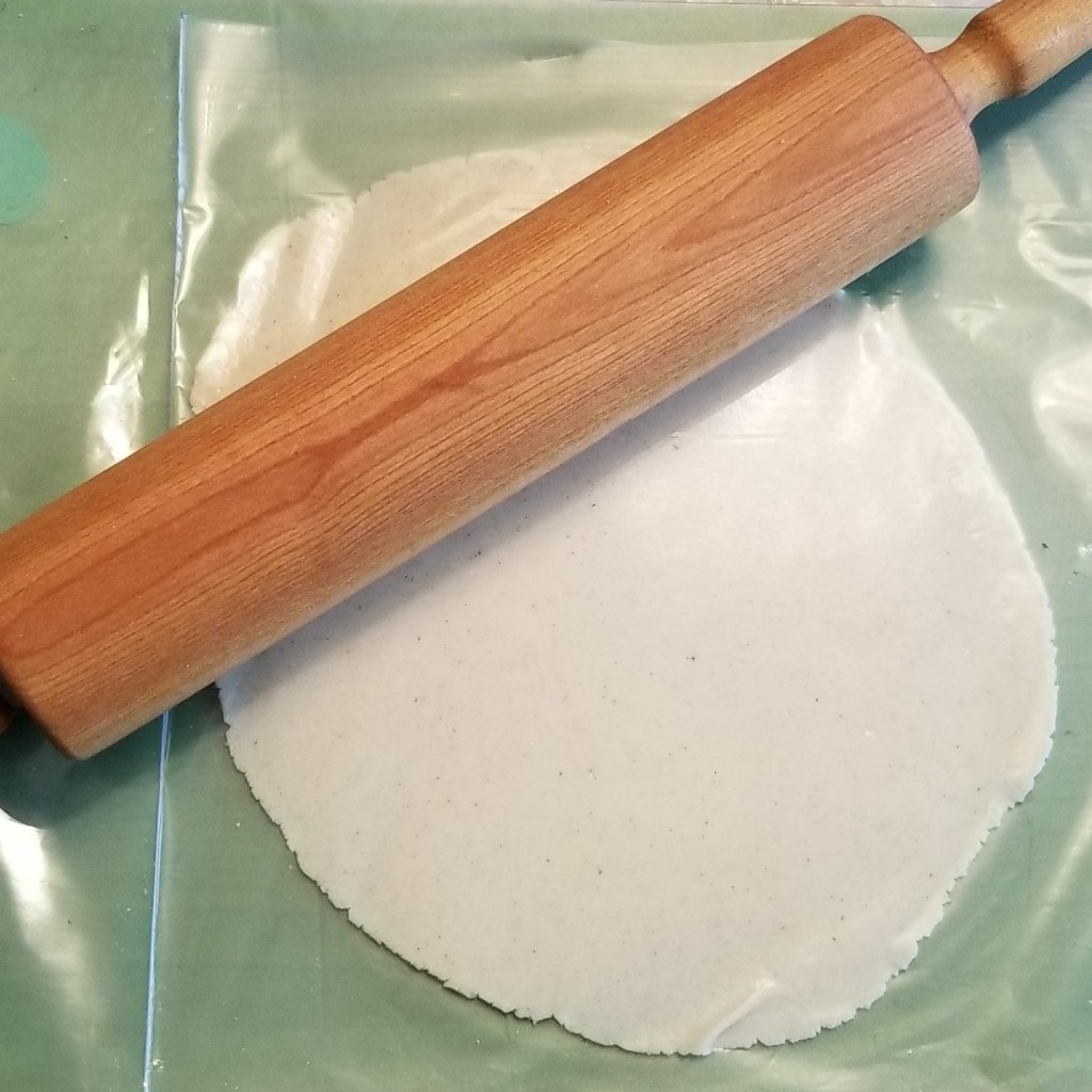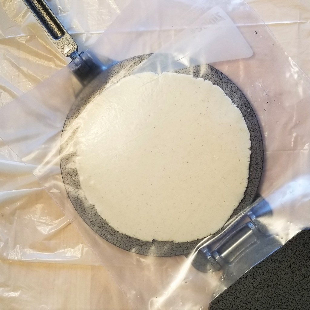 The edges only have a few cracks, so it is ok, but if the disc cracks, form into a ball again, adding  more water and repeating as needed.  The disc from the press is the thickness of a regular tortilla, so it must be flattened even further.  Transfer disc with plastic lining to a baking sheet or a plastic cutting board, then pass a rolling pin over, to make the disc thinner: