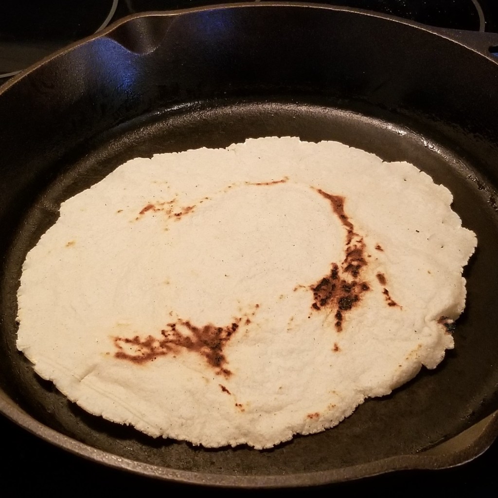 Allow to char only slightly, then flip again to finish the first side.  Remove and repeat with the rest of the dough.  The tlayudas should be crispy but still somewhat pliable (photo at the top of the post).   These tlayudas are relatively small, about 10 inches (25 cm) in diameter, so an alternative is to use a dry iron skillet (no oil) to cook on the stove over medium heat: