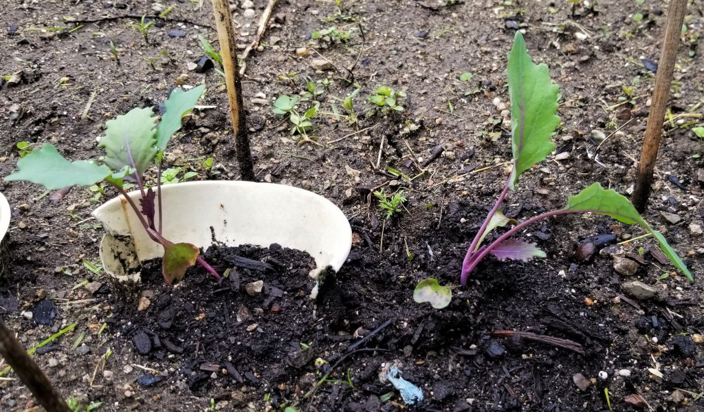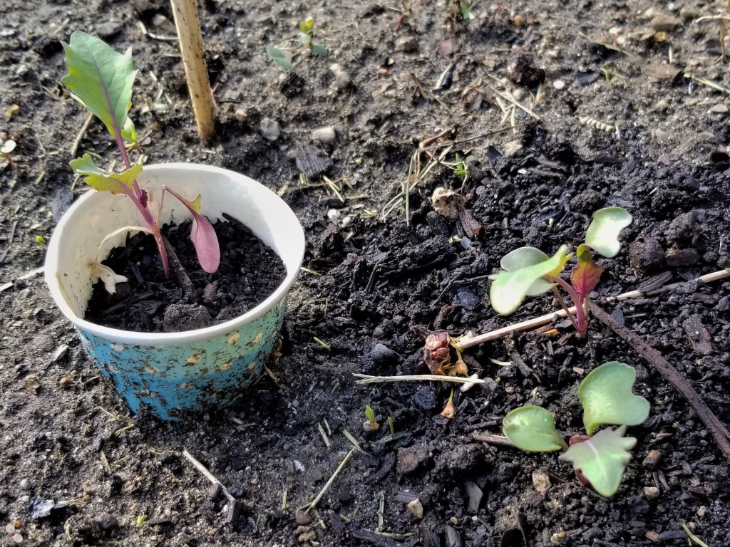I transferred the indoor sprouts to individual paper cups, and a couple of weeks later, I transplanted them to the same bed as the ones sowed directly. In the photo below, a transplanted seedling with the top of the paper cup kept as a protective collar (left) next to two direct-sow seedlings: