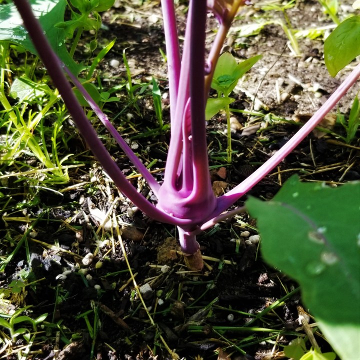 Fully grown kohlrabies are so alien looking, very decorative in the garden bed. The more common varieties have a light green exterior; mine are purple, so shiny, they could be displayed as gems next to rubies or diamonds: