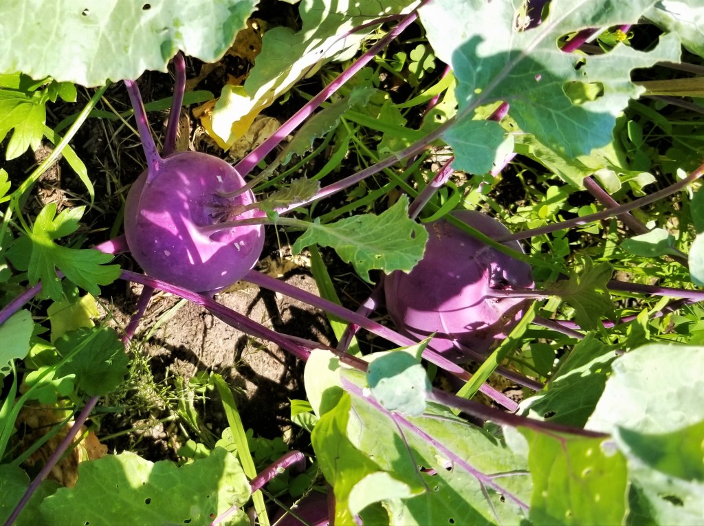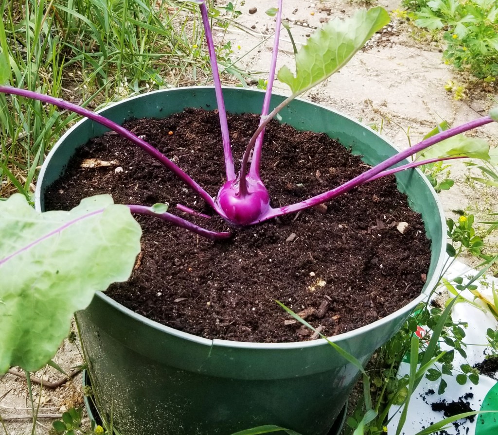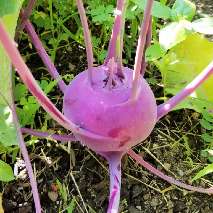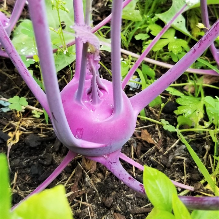 I got kohlrabi in a CSA share – much like cabbage in flavor, but more work to shred. Your purple variety is very pretty! I like your experimentation. I thought my garden tomato plants would be awesome this year, but the ones in pots are doing much better. Go figure.
