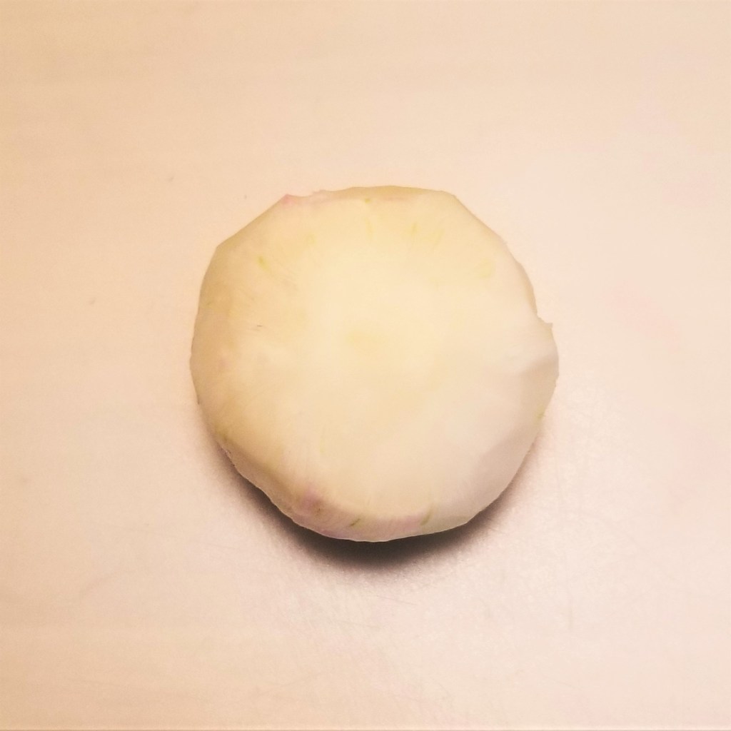 The leaves are edible, but since these already looked eaten up by bugs, I discarded them, along with the top and bottom, after washing thoroughly (photo below, left). I peeled with a paring knife, much like an apple; it was sad at first, to remove the pretty purple outer layer, but that revealed the pristine white flesh (photo below, right):
