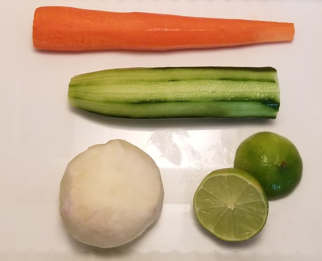 Once the kohlrabi is peeled, as explained above, proceed to wash the lime, carrot and cucumber; peel carrot and cucumber, and slice lime in half: