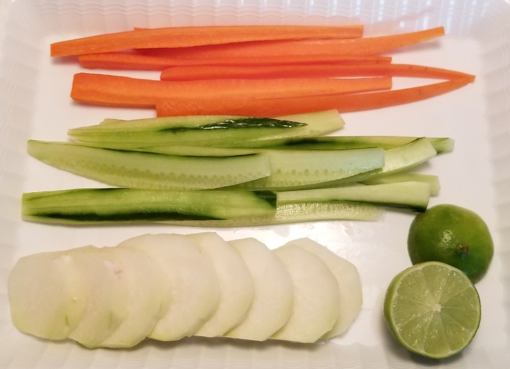 Slice kohlrabi into thin discs. Slice carrots lengthwise in half, then each half lengthwise again into thirds, for six long pieces; repeat with the cucumber, then slicing into thinner sticks, slightly in diagonal, to achieve pointy tips: