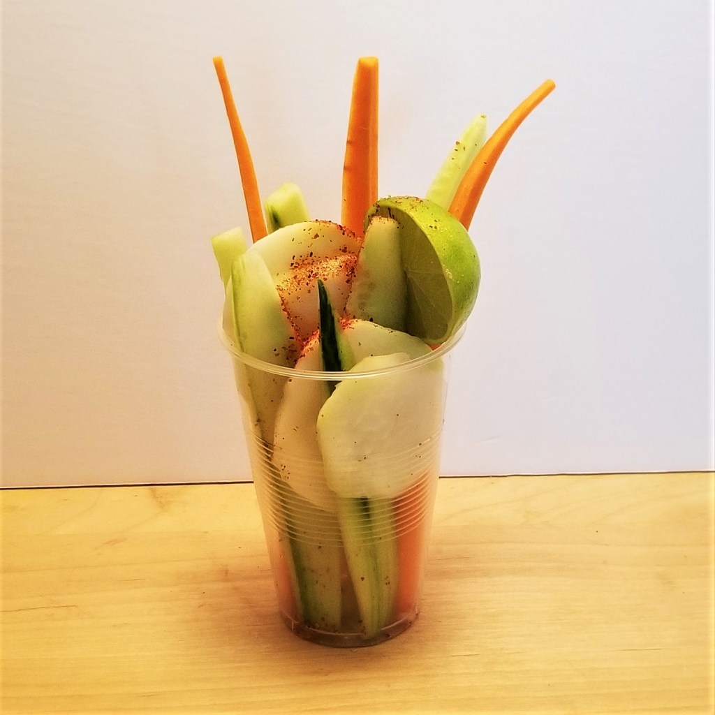 For each portion, arrange half the veggies in a clear plastic cup, leaving enough space to tuck in a half lime, and sprinkle with condiments, to taste: