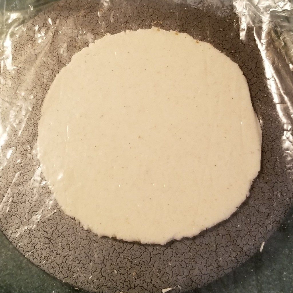 To test for adequate texture, take a portion about the size of a lime, roll into a ball and place between the prepared plastic linings (photo below, left). Gently press to form a thick disc; if it appears cracked, as shown in the photo below, right, add one tablespoon of water to the dough, mix thoroughly:
