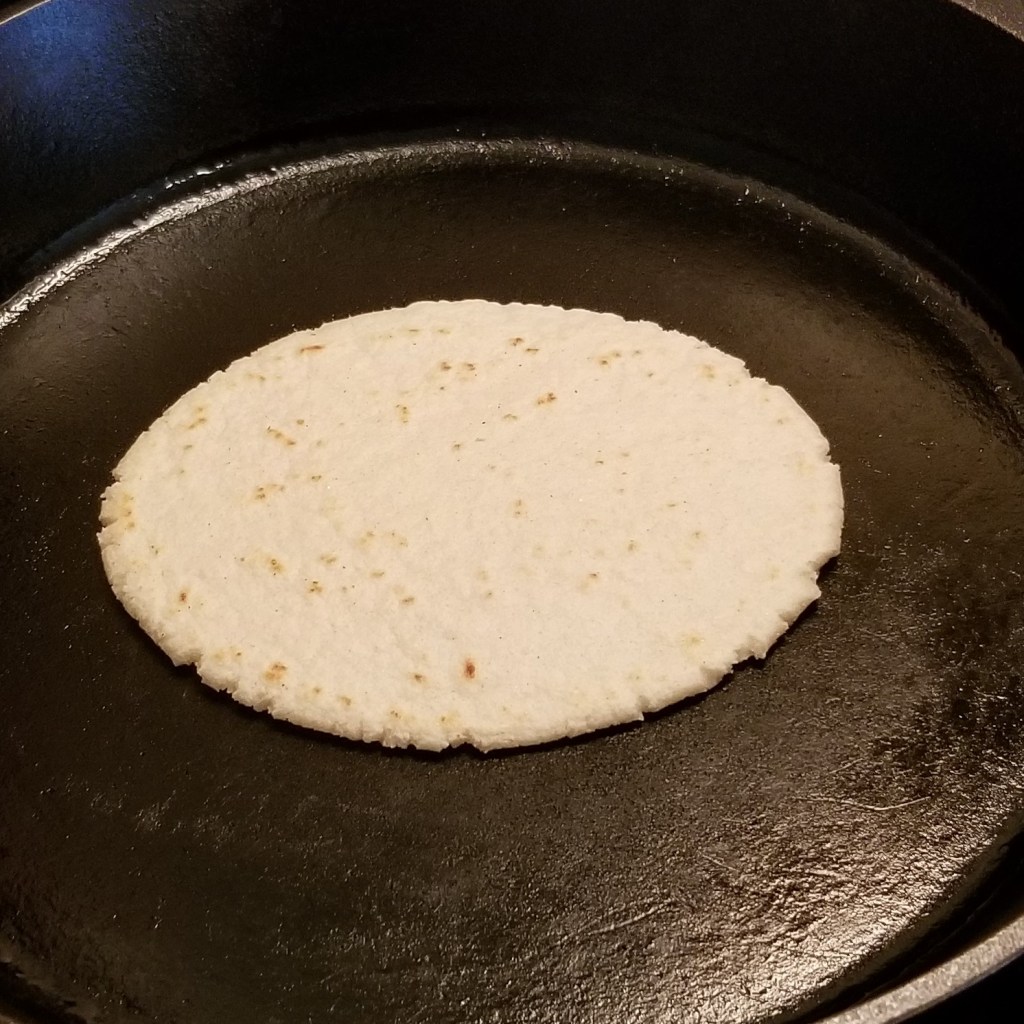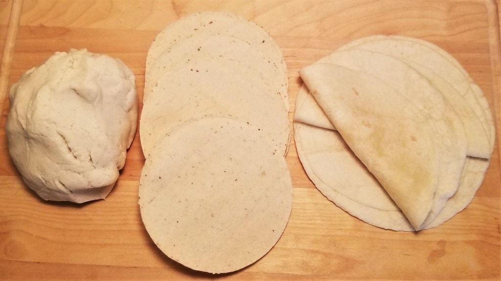 The substrate, from left to right, either from masa (corn dough) or using pre-made corn or wheat tortillas: