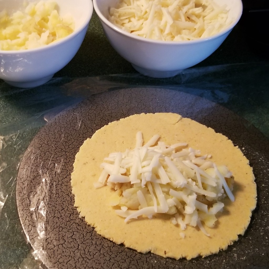 Corn dough with filling, in this case, cheese and potatoes, before folding and sealing for deep frying