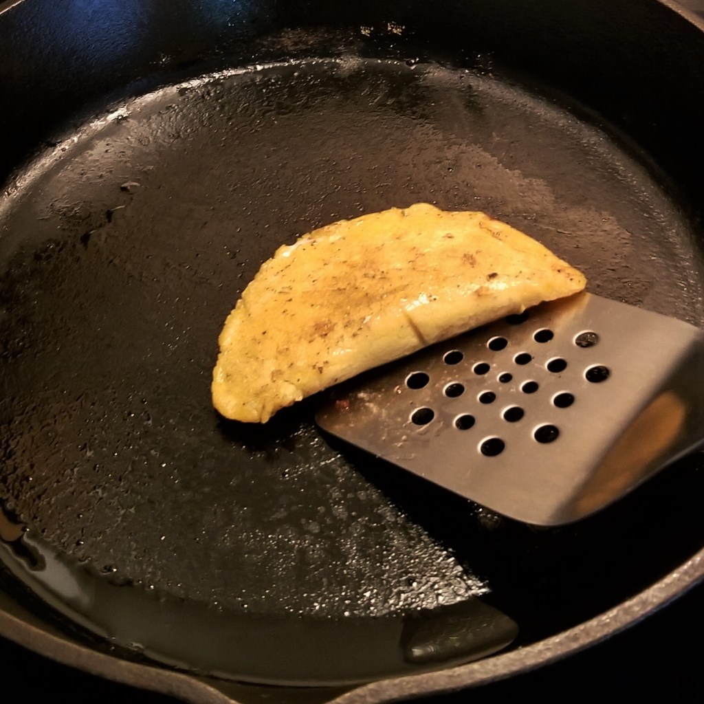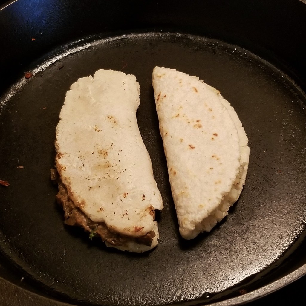 Finally, the cooking methods include: grilling, either by filling and folding a premade corn tortilla (photo below, left), or forming and partially cooking a flat oval shape with corn dough (photo below, centre) then filling, folding, and finish cooking  (photo below, right):