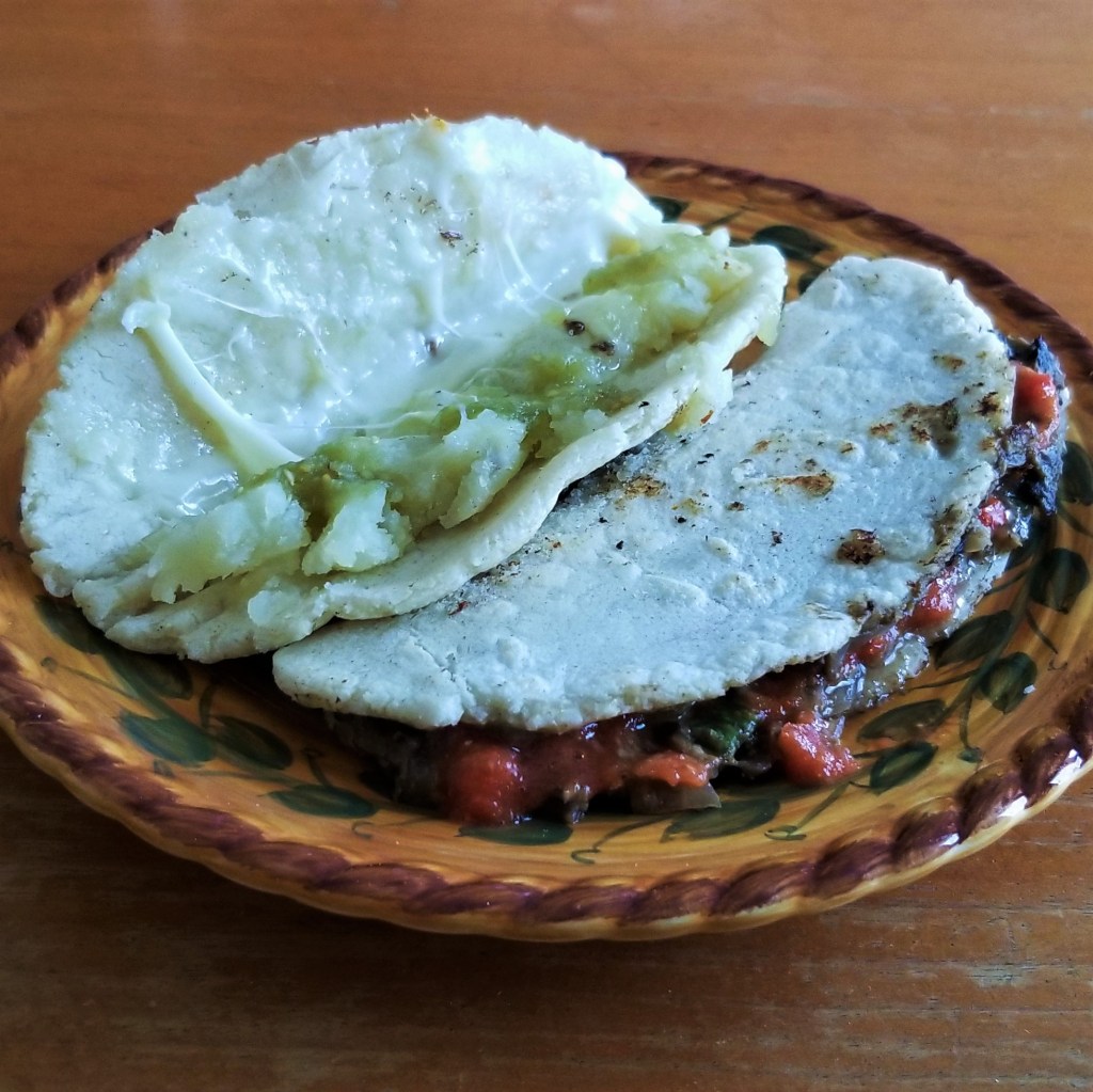 Cheese and potato topped with tomatillo salsa, and mushroom with red sauce quesadillas, both made from corn dough (masa) and grilled (recipe in my next post)