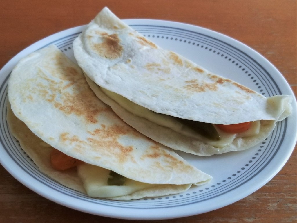3. A wheat or corn tortilla folded in half and filled with cheese and sometimes other ingredients, characteristic of Mexican cuisine.
