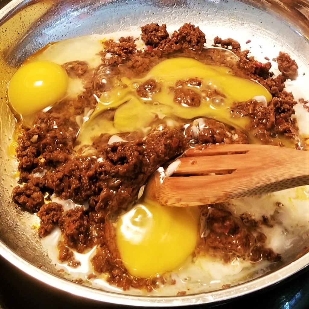 Add vegetable oil to a pan, and fry chorizo over medium heat, stirring occasionally until fully cooked (photo below, left). Crack eggs and add directly to the pan with the crisped chorizo (photo below, centre), stirring and breaking the eggs into chunks until firm (photo below, right):