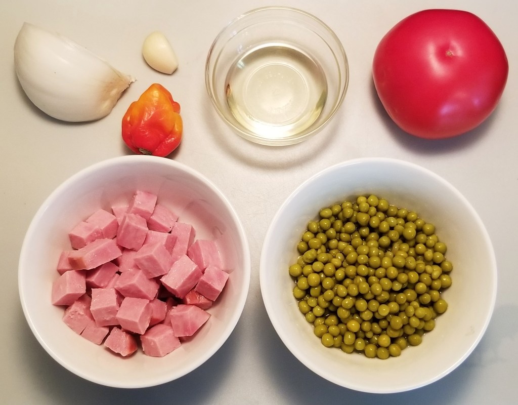 Bring to a boil, then reduce heat to a simmer, and cook for five minutes; add the habanero pepper(s), and cover pot (photo below, left).  After five more minutes, uncover pot and add cubed ham and cooked peas (photo below, right):