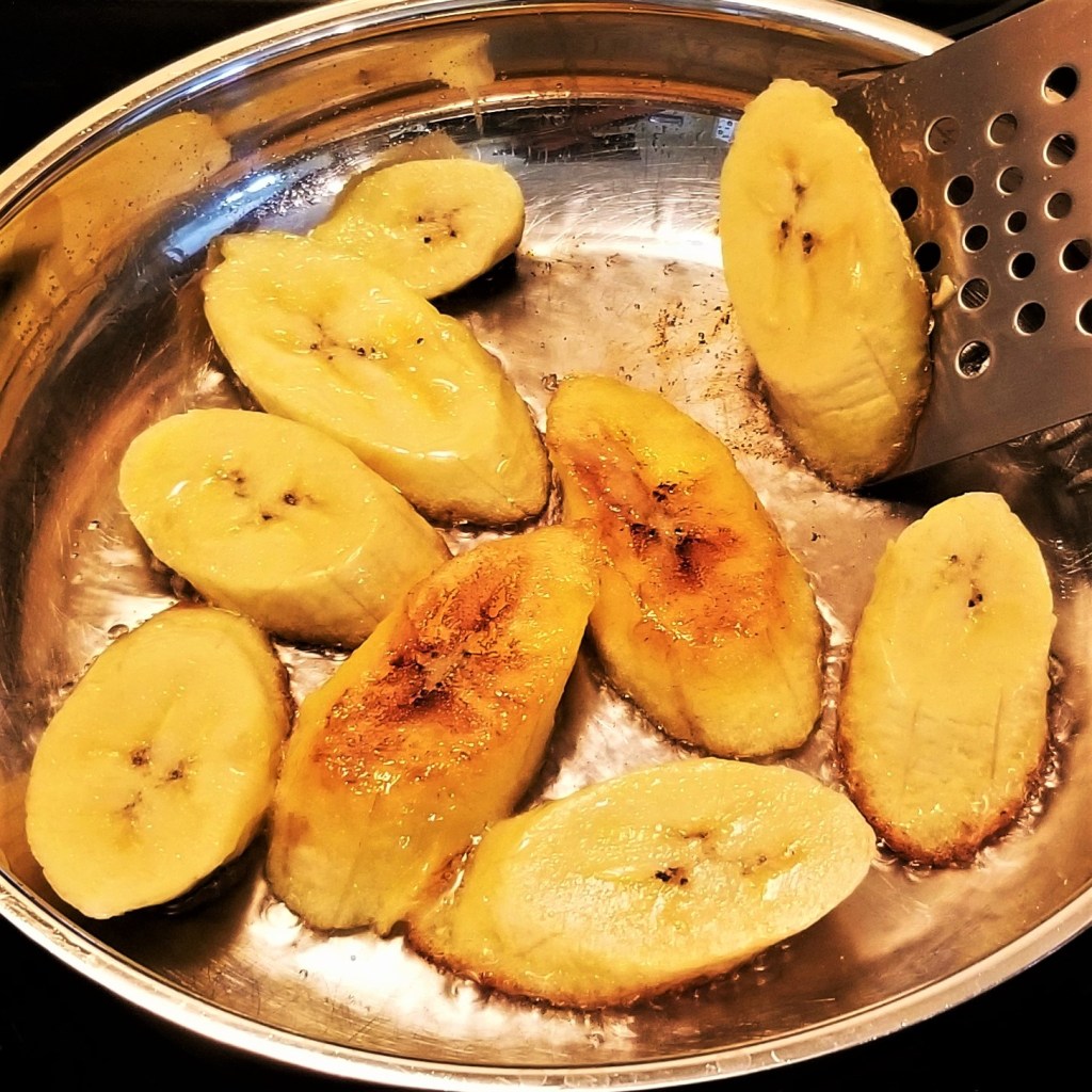 Peel plantain and slice in diagonal.  In a large frying pan, warm up one tablespoon of oil over medium heat, and add plantain; allow to cook until golden brown, then flip slices (photo below, left).  When brown on the other side, transfer to a plate lined with paper towels (photo below, right):