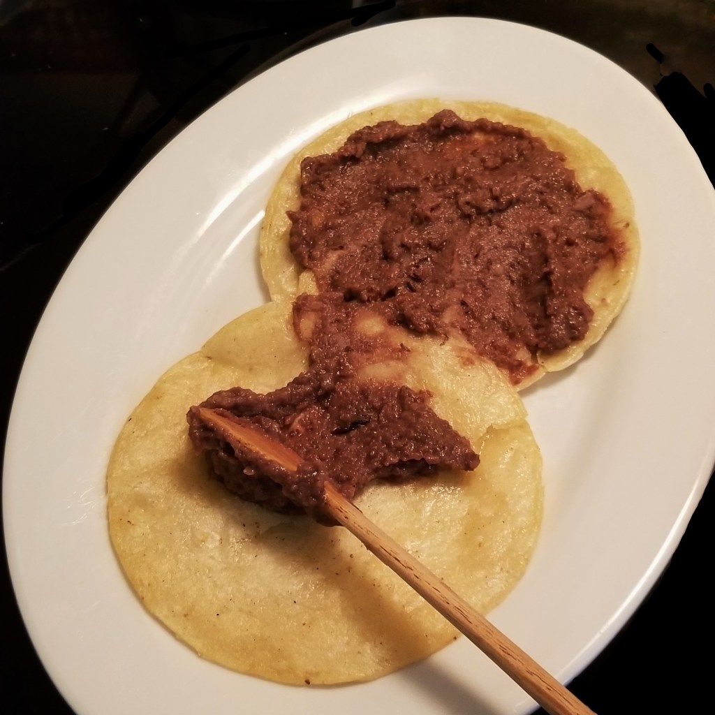 Reserve plantain.  To the same pan, add the last tablespoon of oil, and lightly crisp the corn tortillas, one at a time, for a few seconds on each side (photo below, left).  Transfer tortillas, two per serving plate, and spread one quarter of a cup of refried beans on each tortilla (photo below, right):