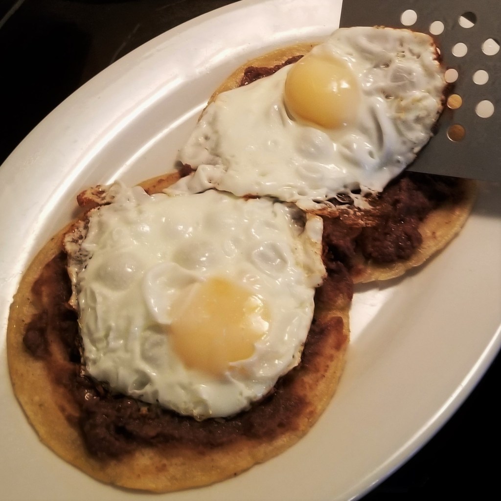 In the same pan, fry two eggs at a time, done to taste; I like to prepare mine by covering the pan to cook the top without having to flip them (photo below, left).  The traditional way to arrange the eggs for motuleños is to place both on top of one of the tortillas, then cover them with the other tortilla, but I was nervous that the egg yolks would break, so I chose to place one egg on top of each tortilla, as shown in the photo below, right: