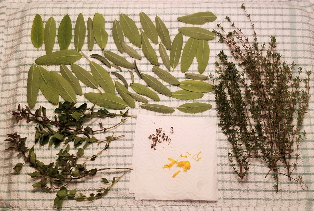 As seen in the photo above, I removed the sage leaves and calendula petals and seed from their stems. I just allowed them to dehydrate completely on the kitchen counter. Once dried, the sage leaves may be kept whole to add to stews or infusions, or crumbled to add to soups, or stuffing: