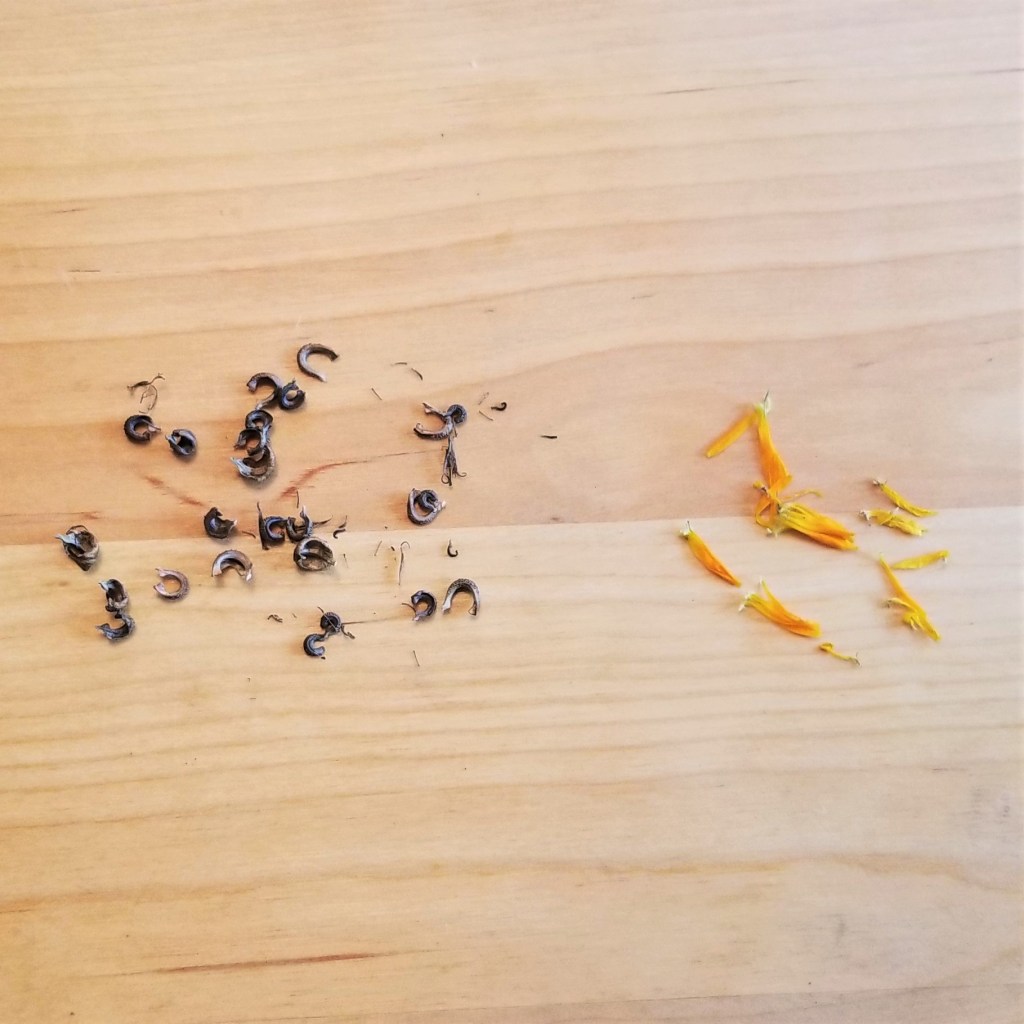My main crop of calendula was harvested and preserved a while ago, but I wanted to show how the seed and petals may be dried, as shown below:
