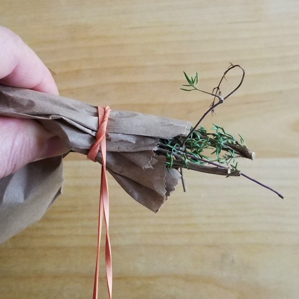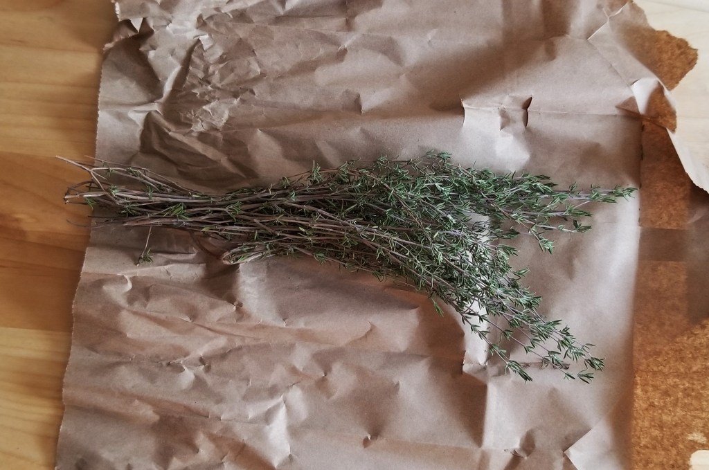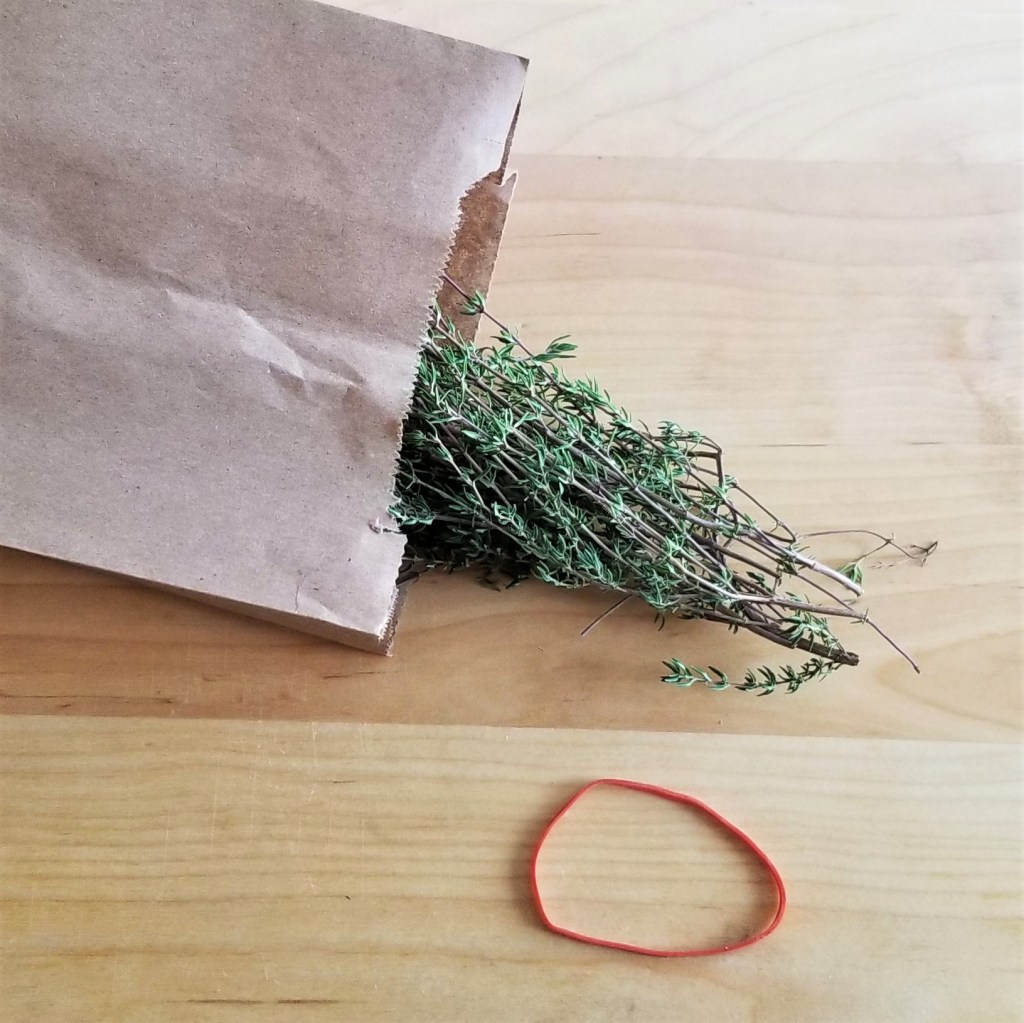 Oregano, thyme and other herbs such as marjoram, have very small leaves, so I dry them on the stems by grouping into bunches and placing them, tips side first, inside paper bags (photo below, left). I close the paper bag around the bottom of the stems, securing with a rubber band (photo below, right):