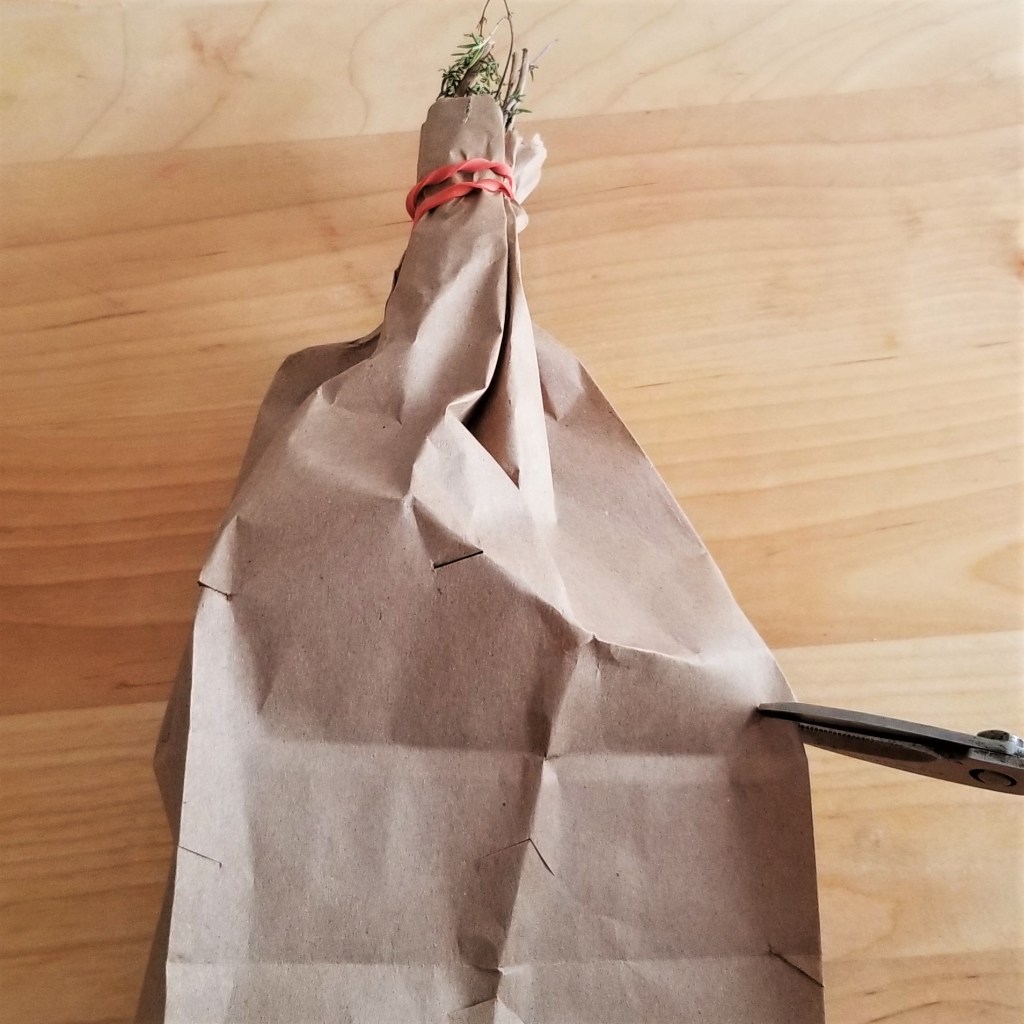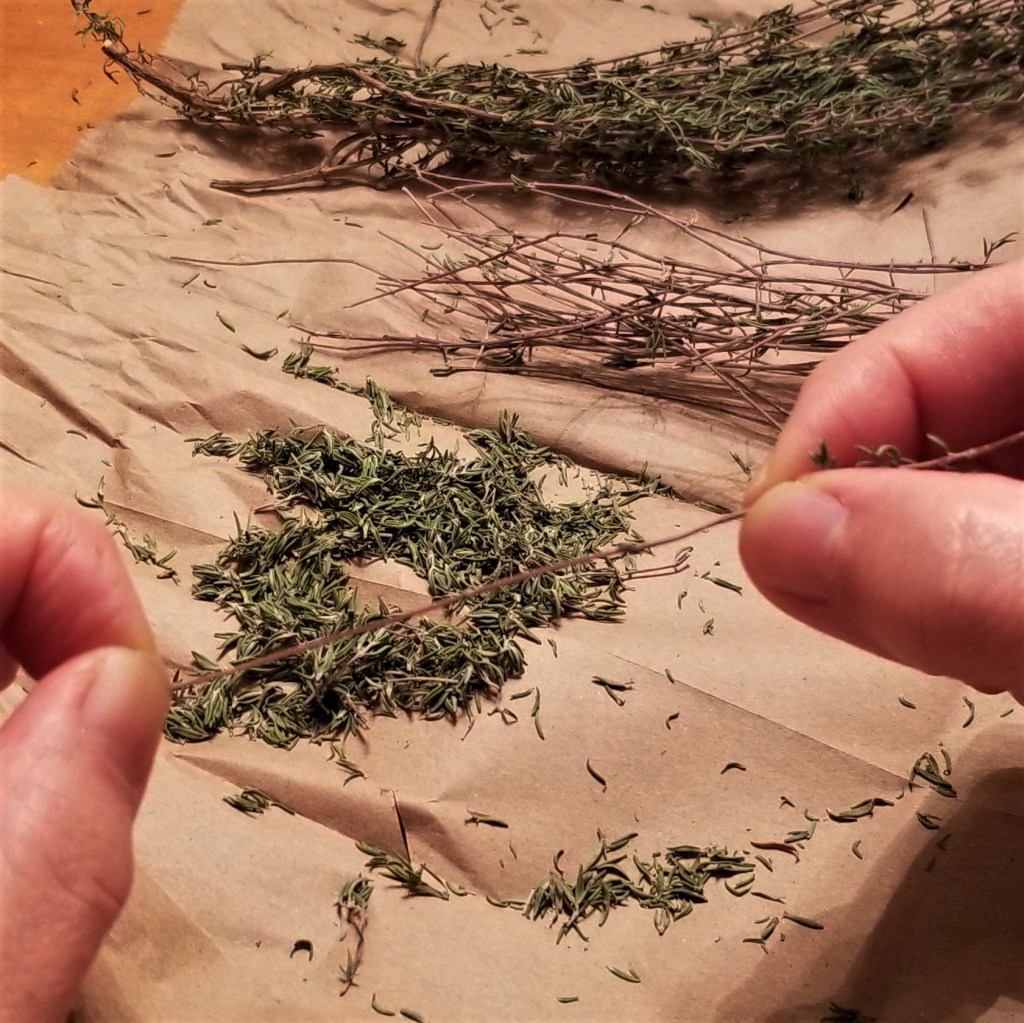 Once the herbs are dry, I cut the paper bag open, and use the paper as the work surface to process the dry leaves: