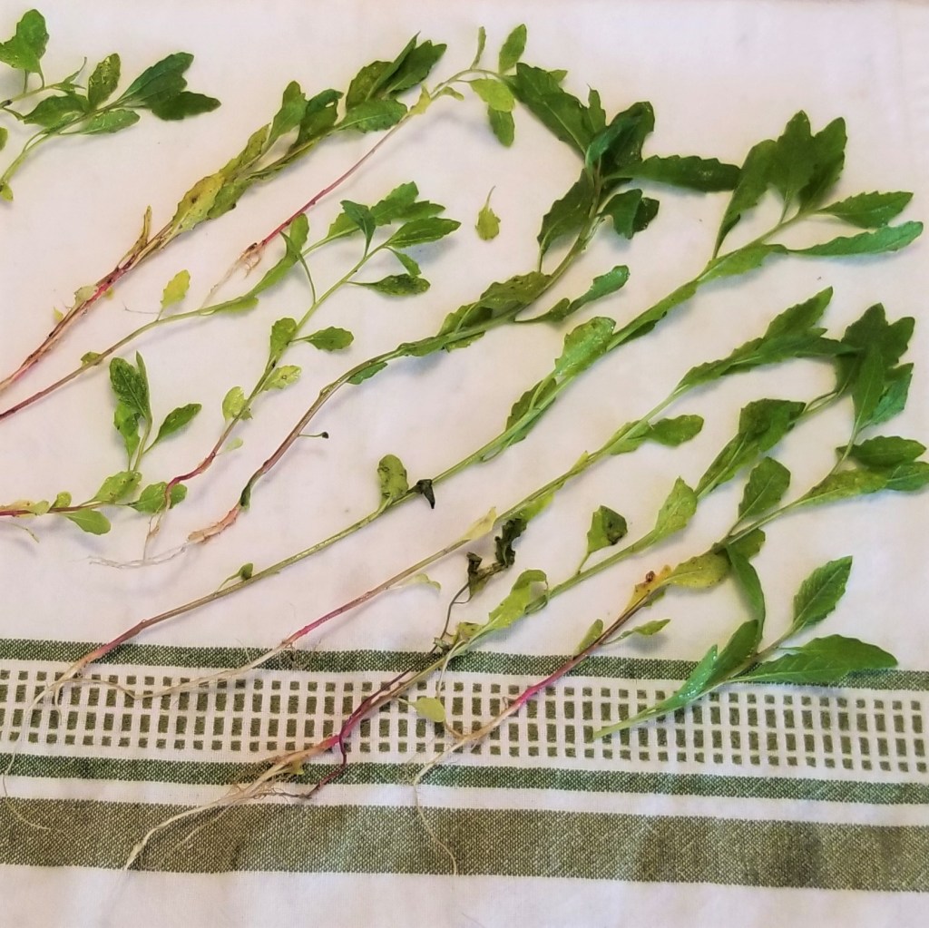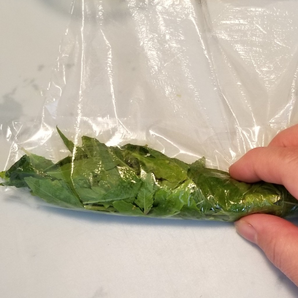 Kept in the freezer, they may be taken out when needed, and chunks from the frozen pile may be broken and added to soups and sauces. Another good way to store them in the freezer, is to roll a bunch into a log, then wrap in plastic or foil, as shown below for epazote: stems must be harvested while green and before seed is produced, then washed and dried (photo below, left); individual leaves are plucked, discarding damaged ones and stems (photo below, centre); a bunch of leaves is rolled into a log and wrapped (photo below, right):