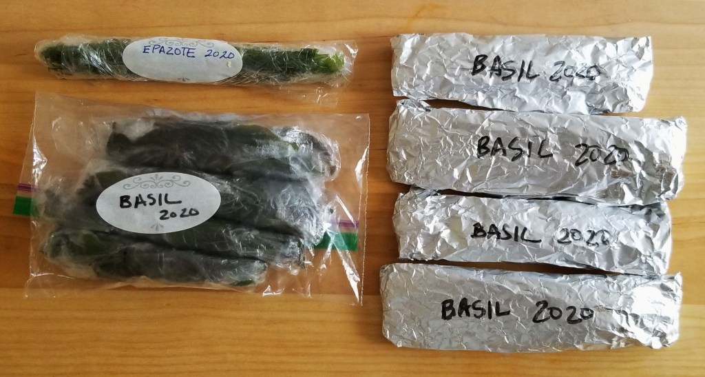 Some people chop fresh leaves and preserve them in ice cubes, but I prefer not to chop until it is time to use the herbs, to preserve their full flavour, and the cubes would take up too much space in my freezer. This method allows me to keep good amounts of herbs in convenient logs that may be sliced frozen to add to different dishes. In the photo below, my epazote roll, as well as several rolls of basil: