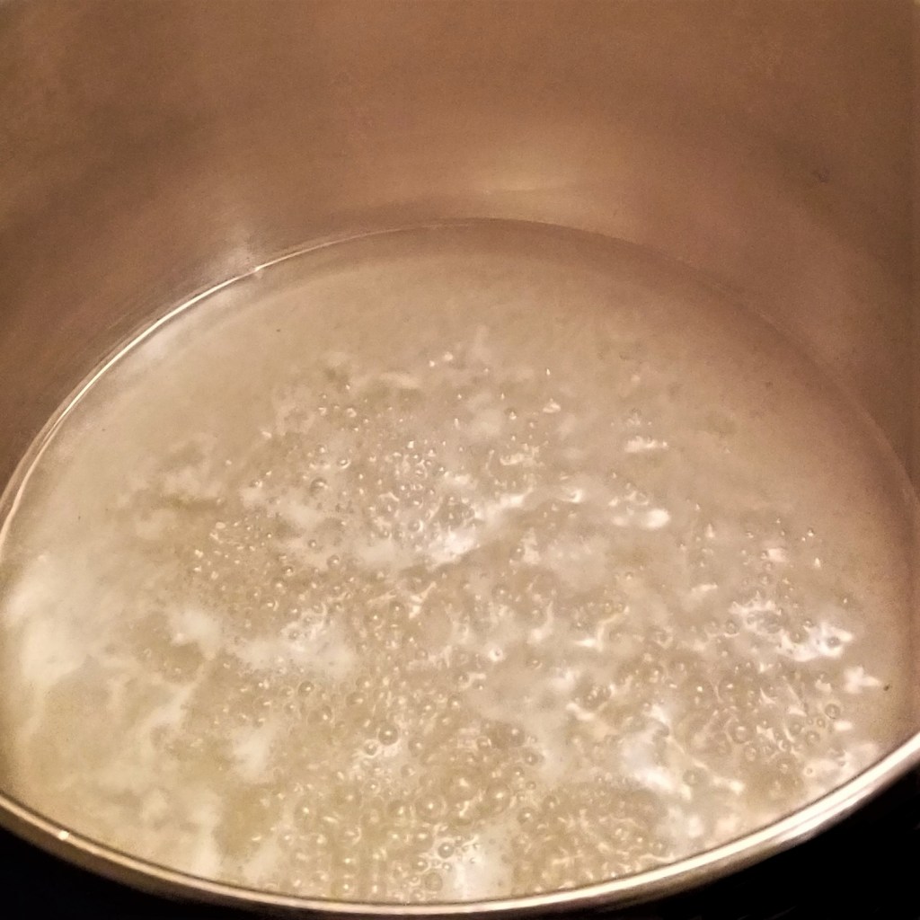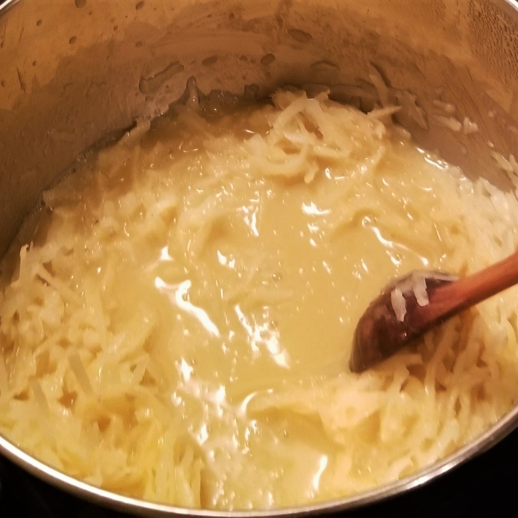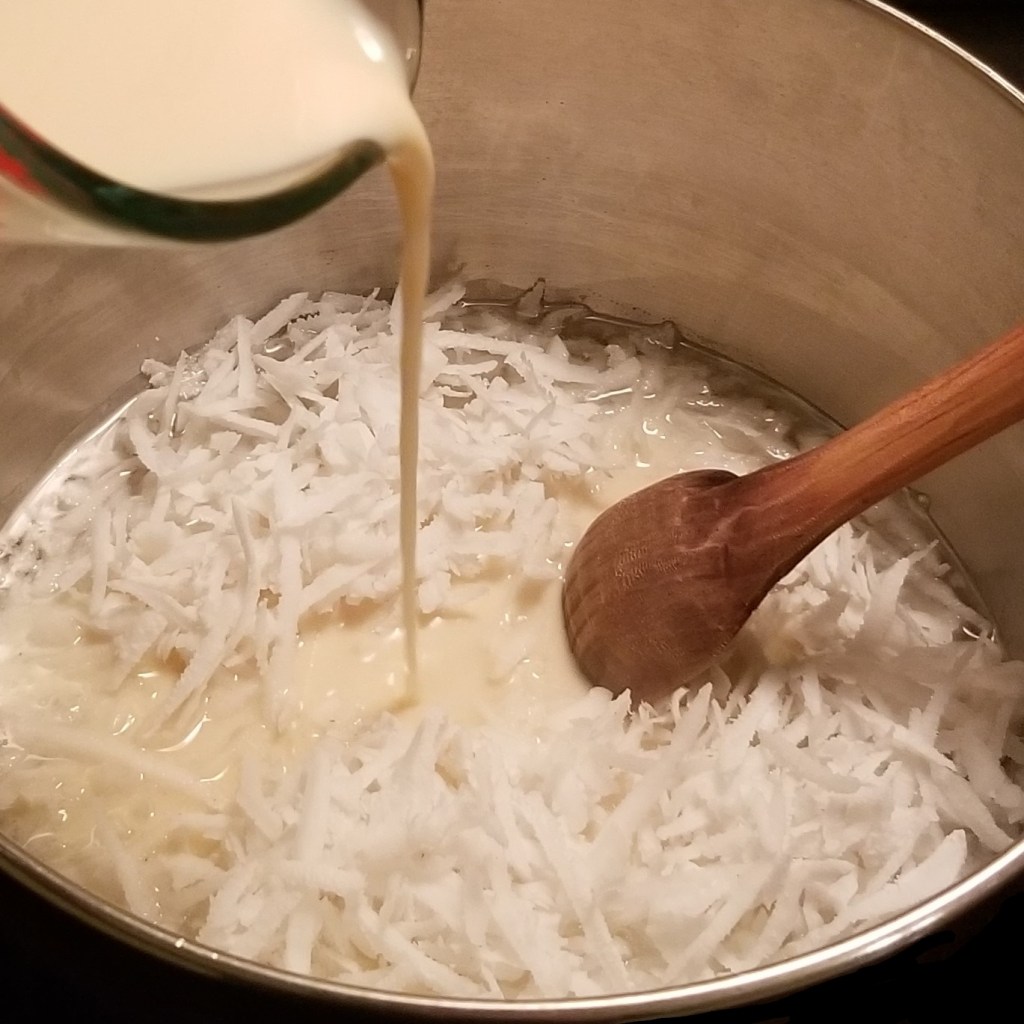 Dissolve sugar in water in a pot.  Bring to boil over high heat, and allow to cook until shinny and syrupy (photo below, left); when a spoonful is tilted back to the pot, it will form a loose thin thread (223-234 °F, 106-112 °C if using candy thermometer).  Add shredded coconut and milk (photo below, right):