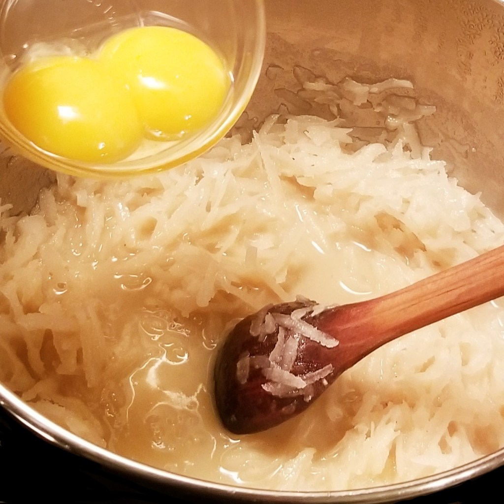 Bring back to boil, then lower heat to medium and cook, stirring, until coconut becomes translucent (about ten minutes).  Turn off heat and wait a couple of minutes, then add egg yolks (photo below, left); stir to incorporate.  Turn on heat at low, and do not arrest stirring until the liquid thickens and becomes custardy (photo below, left):