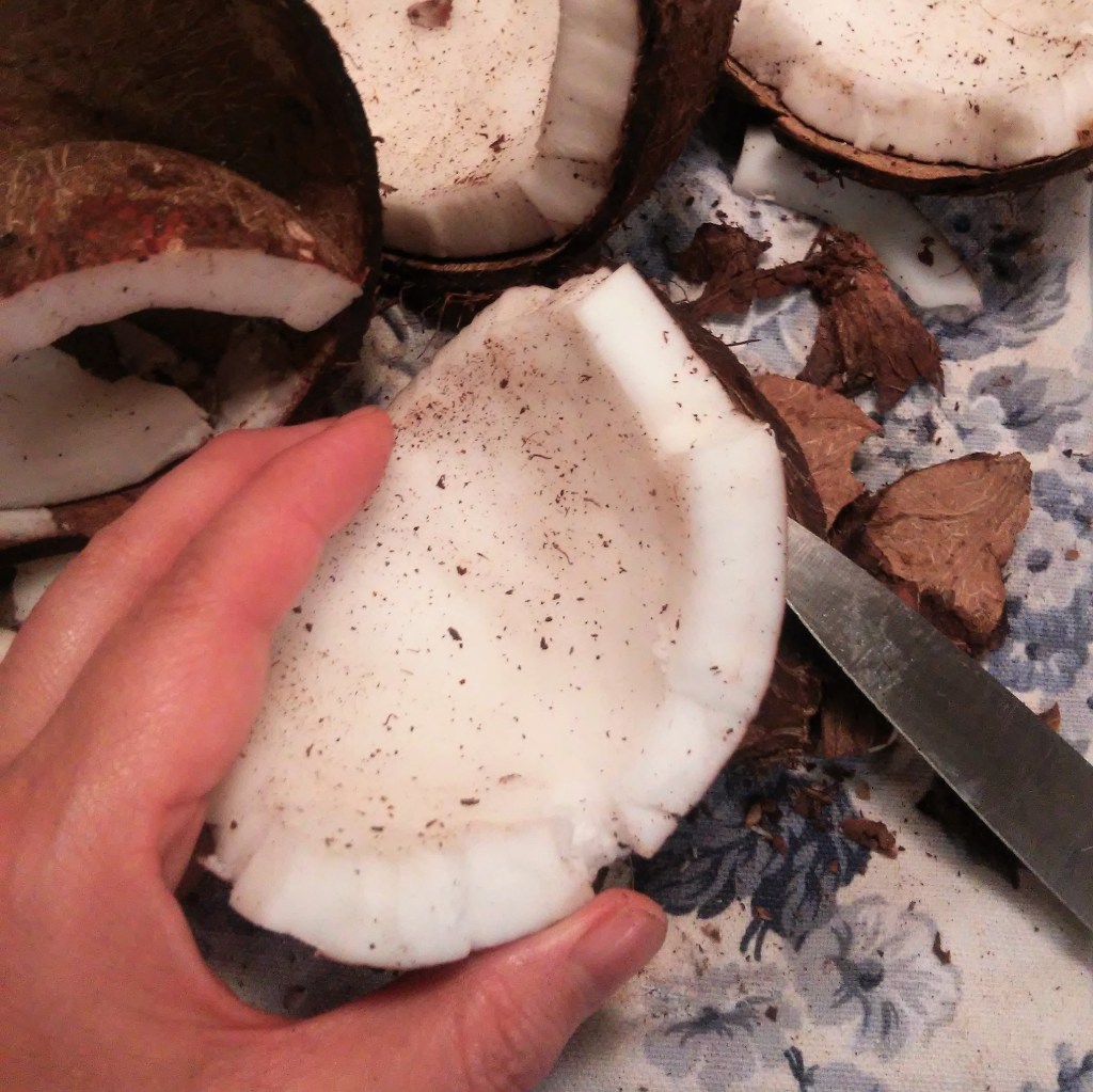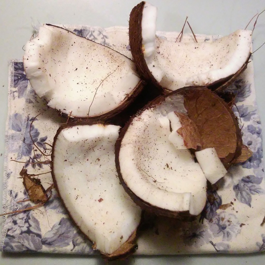 First look at the three dark depressions that look like a face (not an aquiline profile for sure).  To collect the coconut water, use a screwdriver or a corkscrew to puncture the “mouth”, or the smallest of the dark round depressions (photo below, left); place coconut on a cup or small bowl, with the hole facing down, and let the juice drain.  To open the shell, hit along the equator with the claw of a hammer on a very firm surface; the shell will make a sharp cracking sound and neatly break into two pieces (photo below, centre). Check the inside of each half, making sure there is no mould (if there is any mould, the juice and flesh are not safe for consumption).  Place the halves on a firm surface, inner side down, then hit with the hammer to break into smaller pieces (photo below, right):