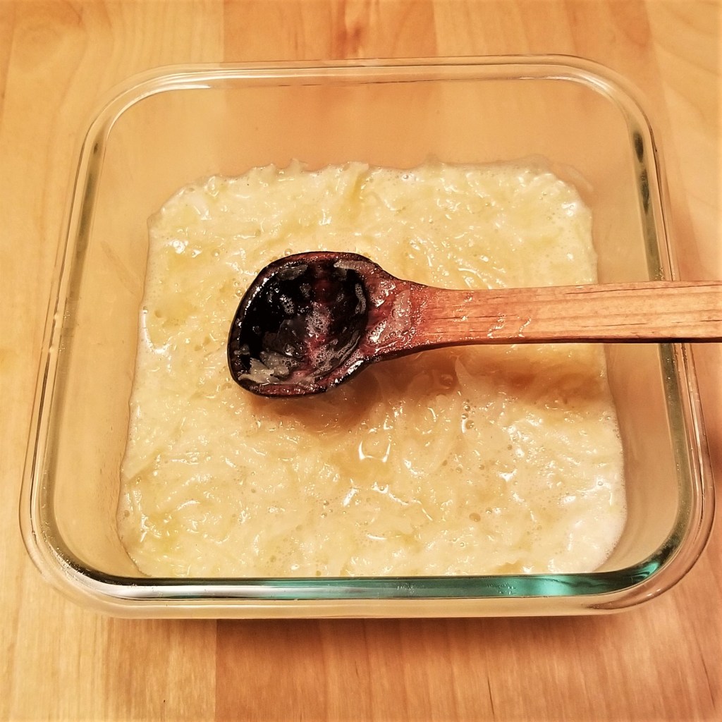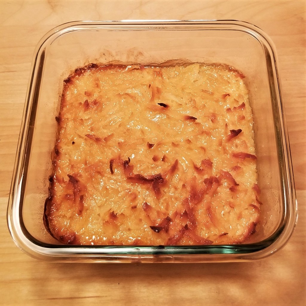 Remove from heat and pour into an 8×8 inch baking dish, flattening the top with the back of a spoon (photo below, left).  Bake in the oven at 375°F (190°C) for 25-30 minutes until the top is golden brown (photo below, right):