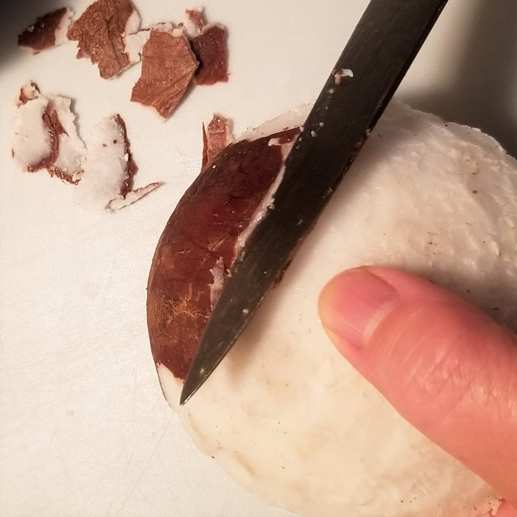 To extract the flesh, insert the tip of a paring knife between the shell and the flesh, then give it a twist to pop the flesh out of the shell (photo below, left).  Discard empty shells.  Rinse flesh pieces and pat dry; they will still have a thin layer of brown tissue attached, which is edible, but it may be removed with a vegetable peeler or paring knife; make sure to have a firm grip on the coconut piece, and strike in between of the brown layer and white flesh swiftly and away from hands to avoid accidents (photo below, centre).  Clean pieces may be kept in a bowl with lid, covered with the coconut water, and stored in the fridge for up to one week.  To shred flesh, use a cheese grater (photo below, right):
