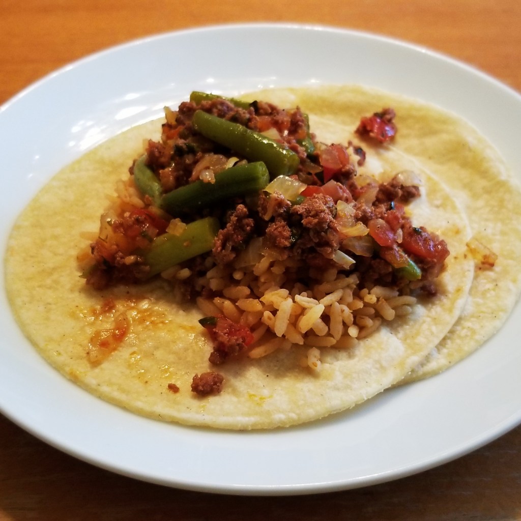 As an example, I took a portion of green beans and chorizo, and made two simple tacos with soft corn tortillas (photo below, left). After just a little while, the tortillas got soaked with the sauce from the guisado, and lifting the saucy tacos without breaking became impossible (photo below, right):