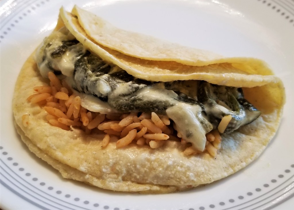 I will share my recipes for Green Beans and Chorizo and Longaniza in Red Sauce in my next posts; in the meantime, to get a nice tacos de guisado menu going, click on the highlighted text for my recipes for Mexican Style Rice, and a few guisados, such as Chiles rellenos (Crispy Stuffed Poblano Peppers), Tinga Poblana (Shredded Beef and Chorizo with Chipotle), Calabacitas con elote y ejotes (Three Sisters Stew), or as pictured below, Rajas con crema (Poblano Pepper Strips with Cream):