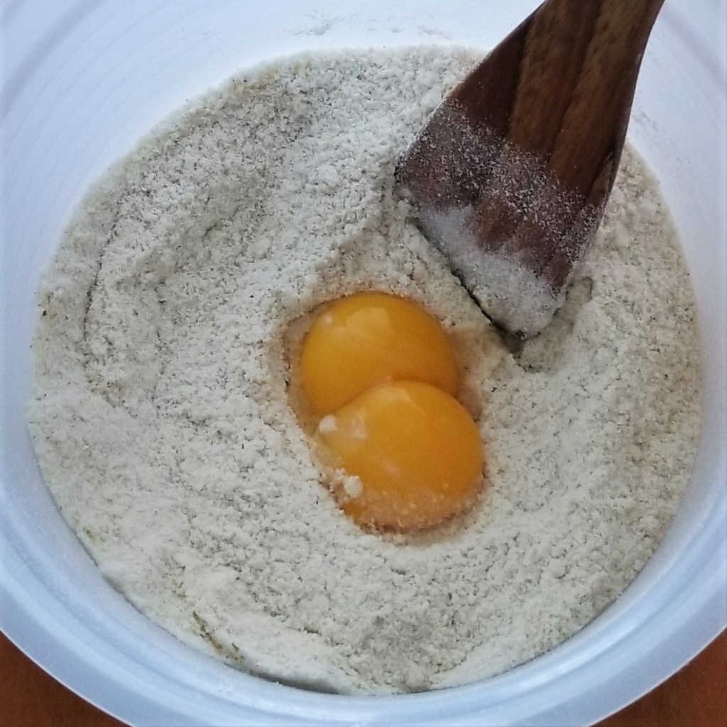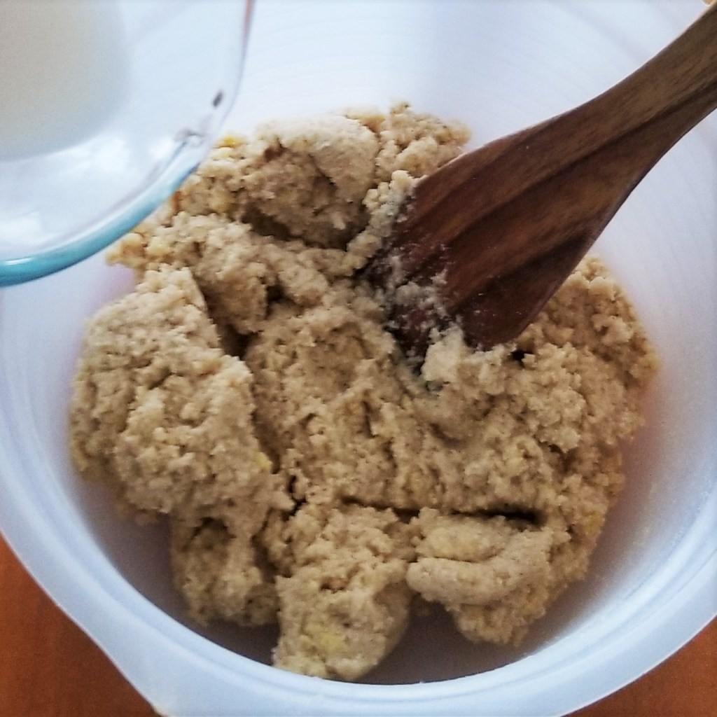 Incorporate well to form a paste, while gradually adding milk (photo below left). Mix with the spatula, then finish by kneading into a ball (photo below, right):