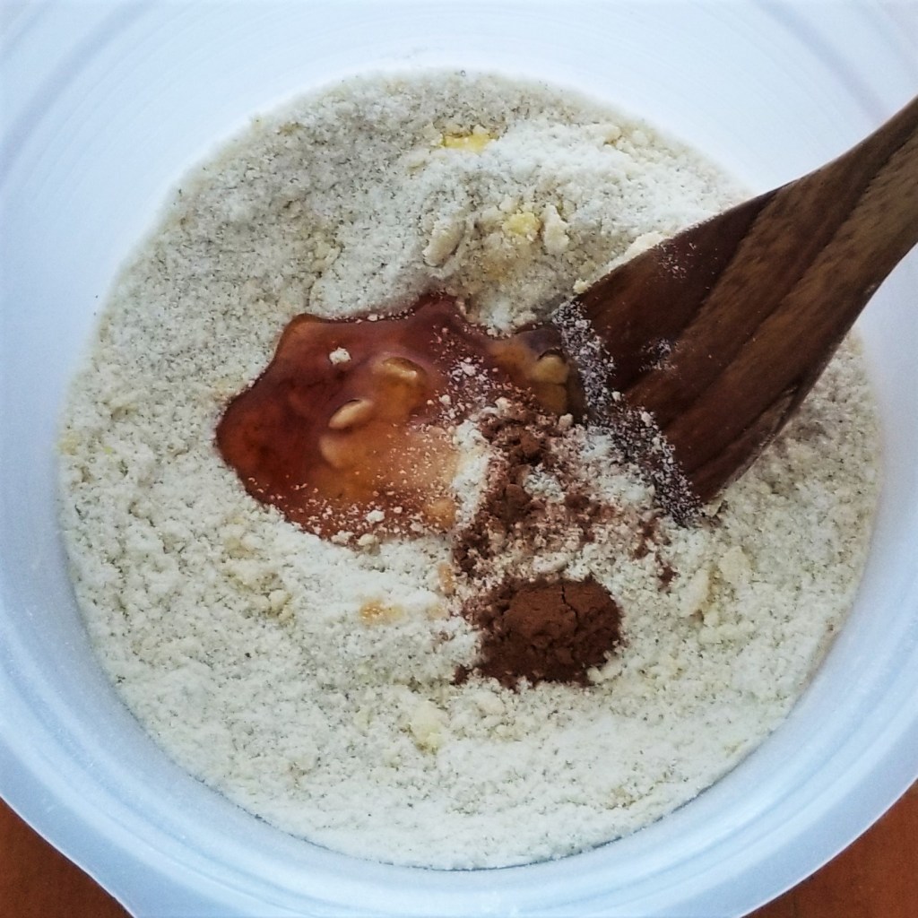 Add egg yolks (photo below, left) and continue mixing, then add honey and cinnamon (photo below, right):