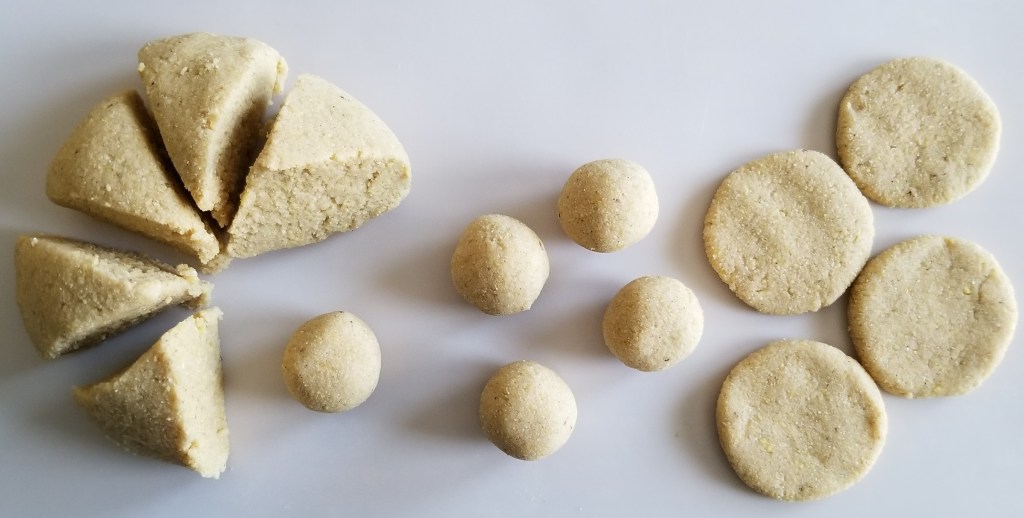 The dough should feel moist and malleable. Transfer dough to a working surface; flatten the ball then slice into eight wedges; work with one wedge at a time, dividing into four to five portions (makes 32-36 patties). Roll each portion into a ball, then flatten into a patty, approximately 2 inches (5 cm) in diameter: