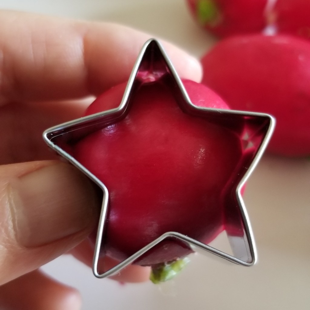 To carve the radishes, I started with easy straight cuts with a paring knife, to create simple pinecones and flowers (photo below, left).  I also used a metal mini cutter, to stamp a star for the top of my tree (photo below, right):
