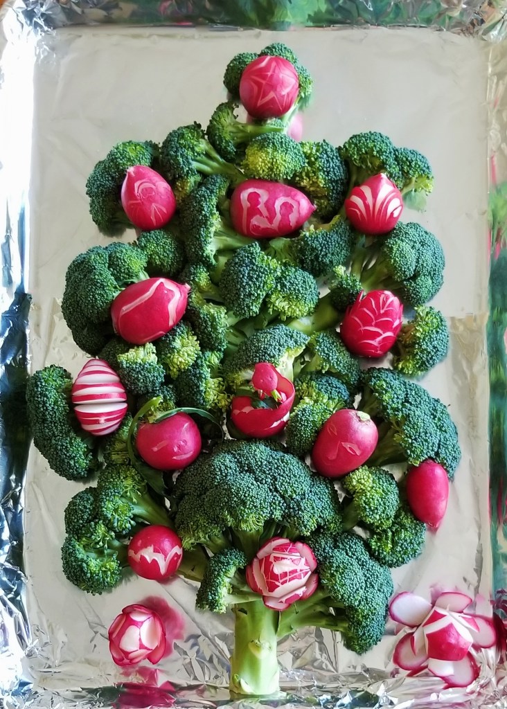 Inspired by this festival, I decided to create my own radish art; the only red radishes available around here this time of year are the round and small Cherry Bell; I bought two bunches at the supermarket, as well as two broccoli heads.  I washed and dried all the produce, then prepared a background of broccoli florets, first slicing the largest ones in half lengthwise, to create flat surfaces, and arranging them in the shape of a tree, in a large tray:
