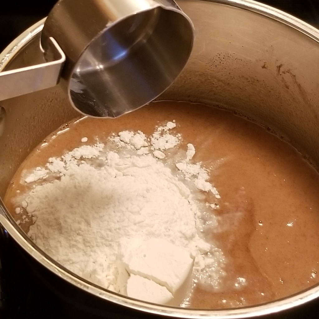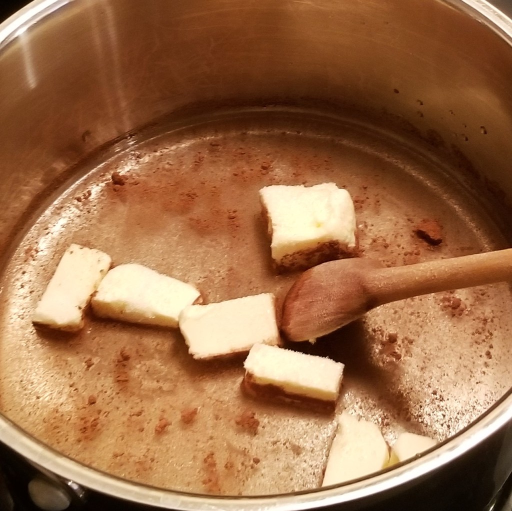 In a pot over high heat, bring water to boil; reduce heat to medium and add sugar, cinnamon and butter (photo below, left). Continue cooking until sugar and butter are completely dissolved. Turn off heat and dump flour in the pot (photo below, right):
