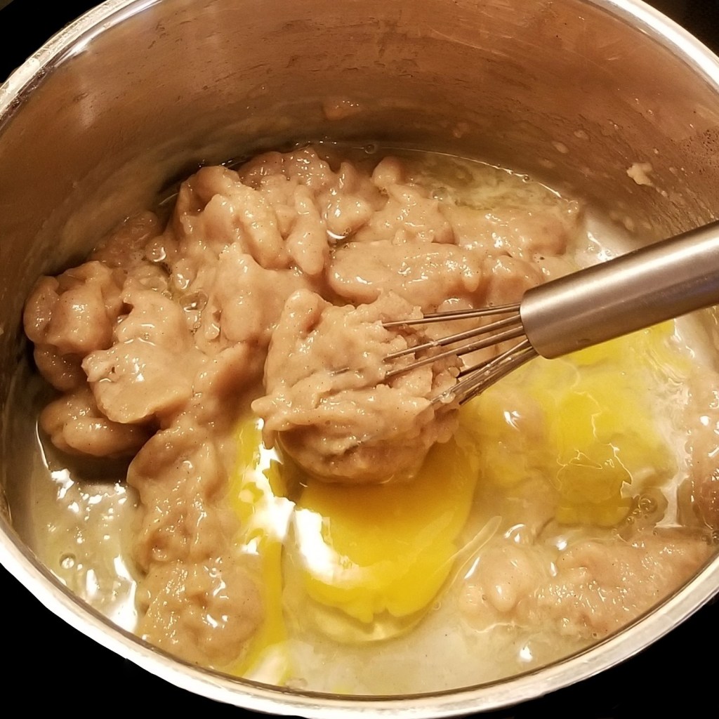 Beat flour and liquid mix vigorously (photo below, left), and continue to incorporate into a smooth and thick paste. Remove pot to a cool surface and add egg, and continue mixing (photo below, right):