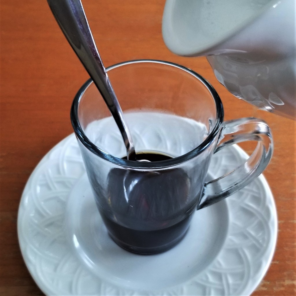 In the early 1800s, towards the end of the Spanish rule in Mexico, the first cafés opened in Mexico City, and coffee was served, “ … estilo de Francia: esto es, endulzado y con leche.” (“… the French way, that is, sweetened and with milk.” Quote from “Cocina Mexicana o Historia Gastronómica de la Ciudad de México” by Salvador Novo, Mexico City’s Chronicler, Ed. Porrúa*). In the early 20th century, many famous cafés were established, such as Café de Tacuba and El Café Fénix. In Spain and Mexico, café con leche is traditionally served in a tall cup made of thick glass; a metal spoon is placed in the empty cup to prevent it from cracking when hot strong coffee is poured first (photo below, left), and then hot milk (photo below, right):