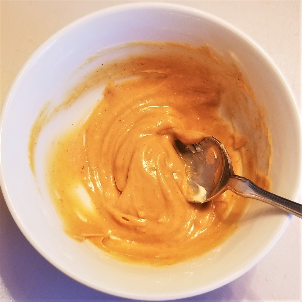 Place the peanut butter, margarine and sugar in a small bowl (photo below, left), and mix thoroughly until creamy and uniform (photo below, right):