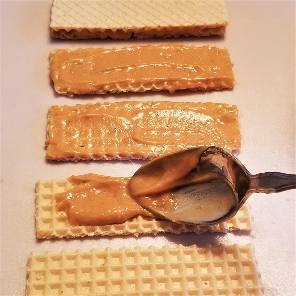 Arrange four of the reserved wafer rectangles on the working surface, with the grid pattern facing up; divide the filling amongst them, spreading to coat, then close with another wafer rectangle (grid facing down) to form sandwiches: