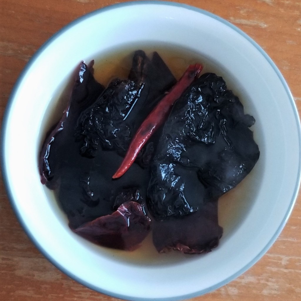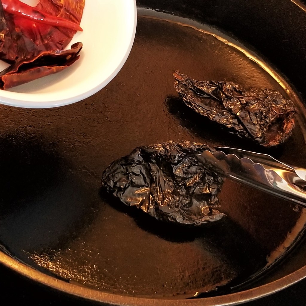 Roast using a dry skillet (no oil) over medium heat: Start with the ancho, guajillo and spicy (if using) peppers, just until they become fragrant, turning frequently to avoid burning, and transferring promptly to a bowl (photo below, left). Add one cup of boiling water to the bowl, and allow peppers to soak (photo below, right):