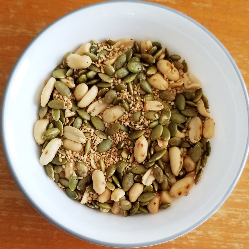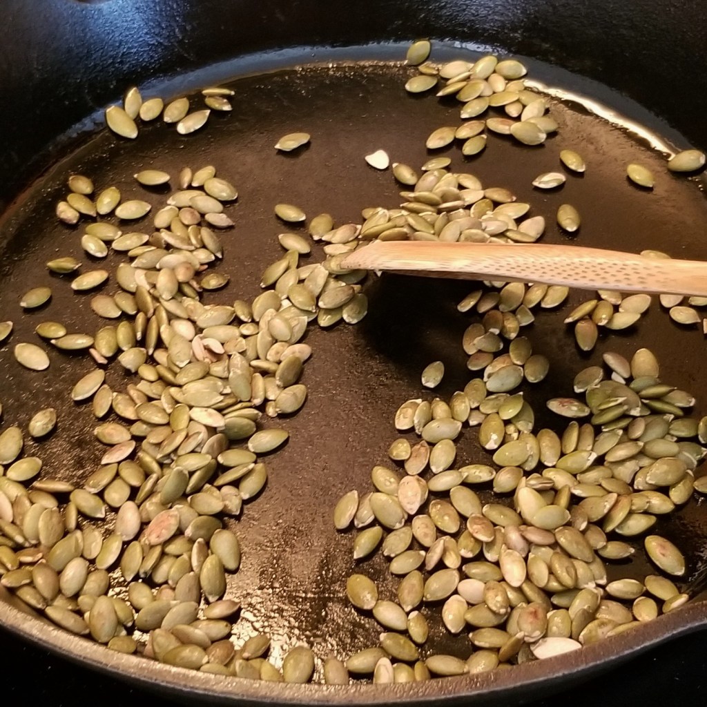 Roast seeds, stirring constantly, starting with the pumpkin seeds (photo below, left). Transfer to a bowl, repeat with the peanuts, and finish with the sesame seed, adding them to the same bowl (photo below, right):